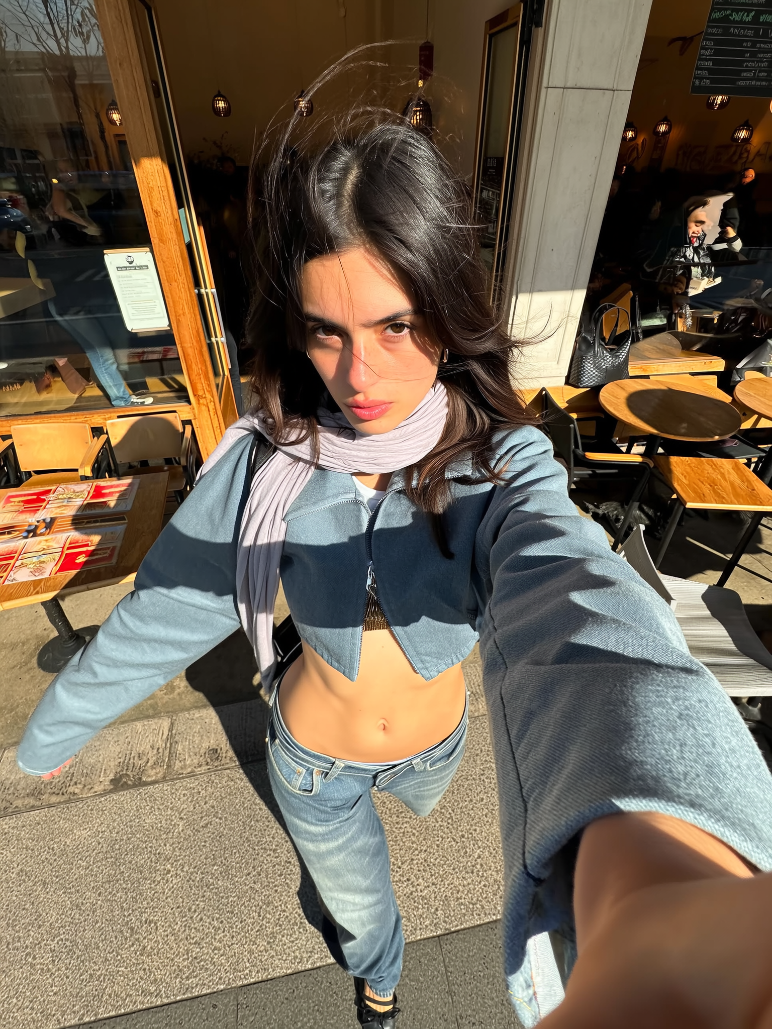 A spontaneous, playfully casual iPhone selfie from a distinctly exaggerated elevated wide-angle perspective capturing a young woman mid-step as she exits a realistically detailed urban café. She wears a uniquely styled cropped jacket layered over a light scarf, carefully chosen to reflect an original social-media-inspired fashion aesthetic with an engaging yet neutral facial expression directly facing the camera lens. Bright, warm sunlight creates vivid natural shadows and highlights on her outfit and surroundings, illuminating the textured wooden tables and metal chairs behind her with authentic urban café wear and subtle imperfections. Realistic fabric wrinkles, individual hair strands slightly tousled by motion, and natural skin textures are clearly visible. The composition naturally emphasizes wide-angle distortion enlarging her upper body and face, with casual one-arm-held selfie framing, capturing the playful confidence and stylish spontaneity typical of candid social media selfies.