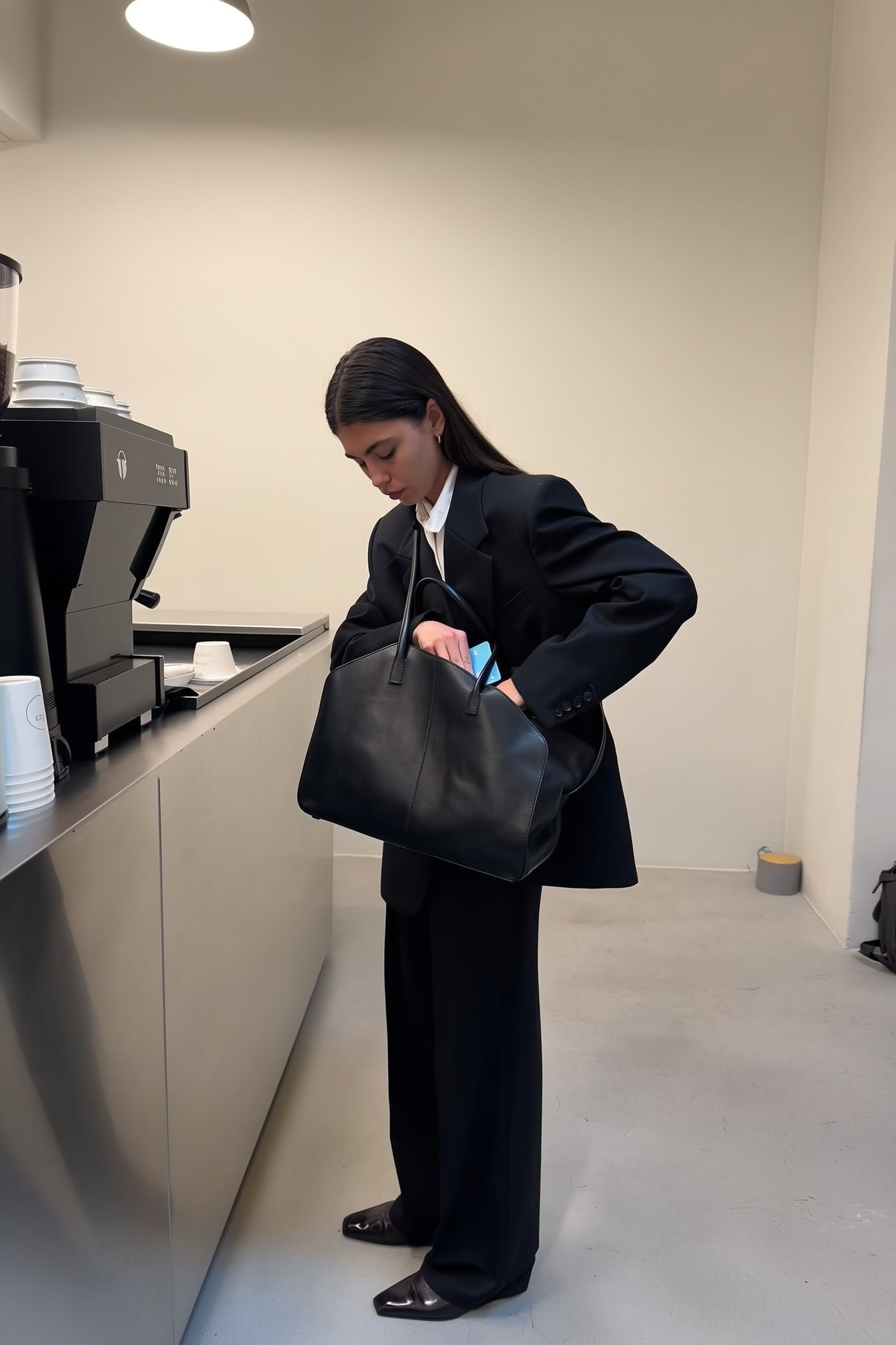 18. A girl in a business suit stands at a café counter, one hand inside her large black tote bag, searching for her card. Minimalist setting, neutral tones, and overhead lighting. iPhone perspective.