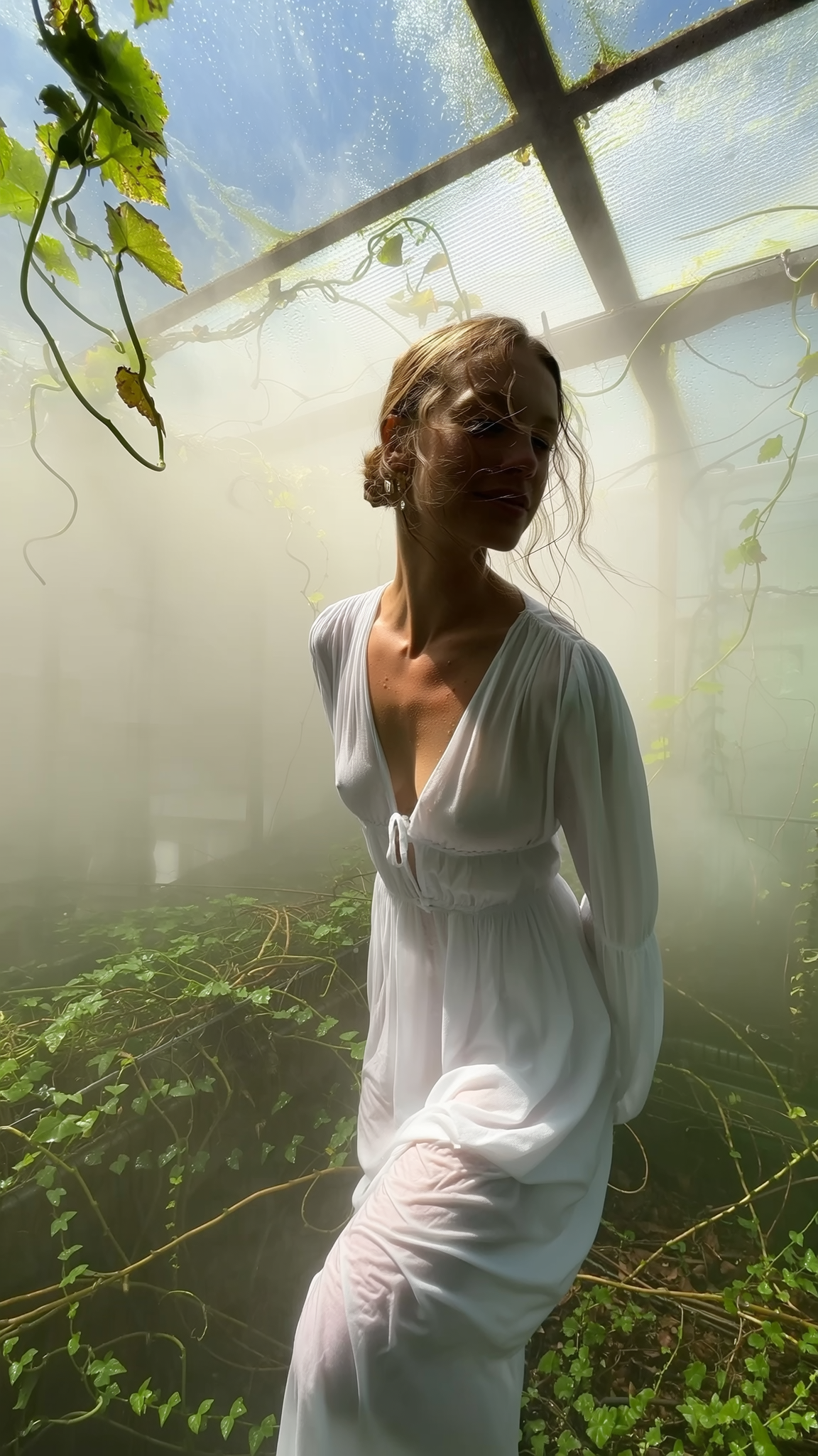 A pale woman clad in a softly flowing white dress emits a gentle, radiant white glow that softly diffuses around her figure as she stands naturally amidst an empty greenhouse filled with thick mist and twisting green vines. Her pose is uncontrived and still, bathed in dramatic natural light piercing softly through broken glass panels overhead. Her skin reveals delicate natural textures of warmth and pores, slightly flushed by the cool, moist air inside the greenhouse, while stray wisps of hair loosely frame her face, catching faint glimmers of light. Deep green vines shimmer subtly with moisture, enveloped by a thin, ethereal white fog that permeates the glass enclosure. The white fabric of her dress wrinkles gently at the folds, emphasizing tangible texture. The image is captured from a casual, slightly angled iPhone perspective, enhanced by soft focus, light haze, and the characteristic warm, diffuse shadows typical of spontaneous forest shade photography.