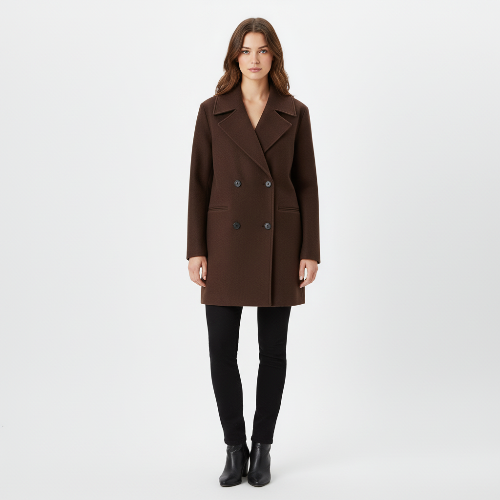 A highly detailed, photorealistic fashion photograph of a beautiful woman model with brown hair, slim athletic build, full-body front view fully visible, entire height captured completely without any cropping, wearing the exact clothing item from the provided product reference image fitted perfectly on her body as the focal outfit, soft natural lighting, seamless plain white studio background, ultra-high resolution, sharp focus, no distortions, no text or logos.