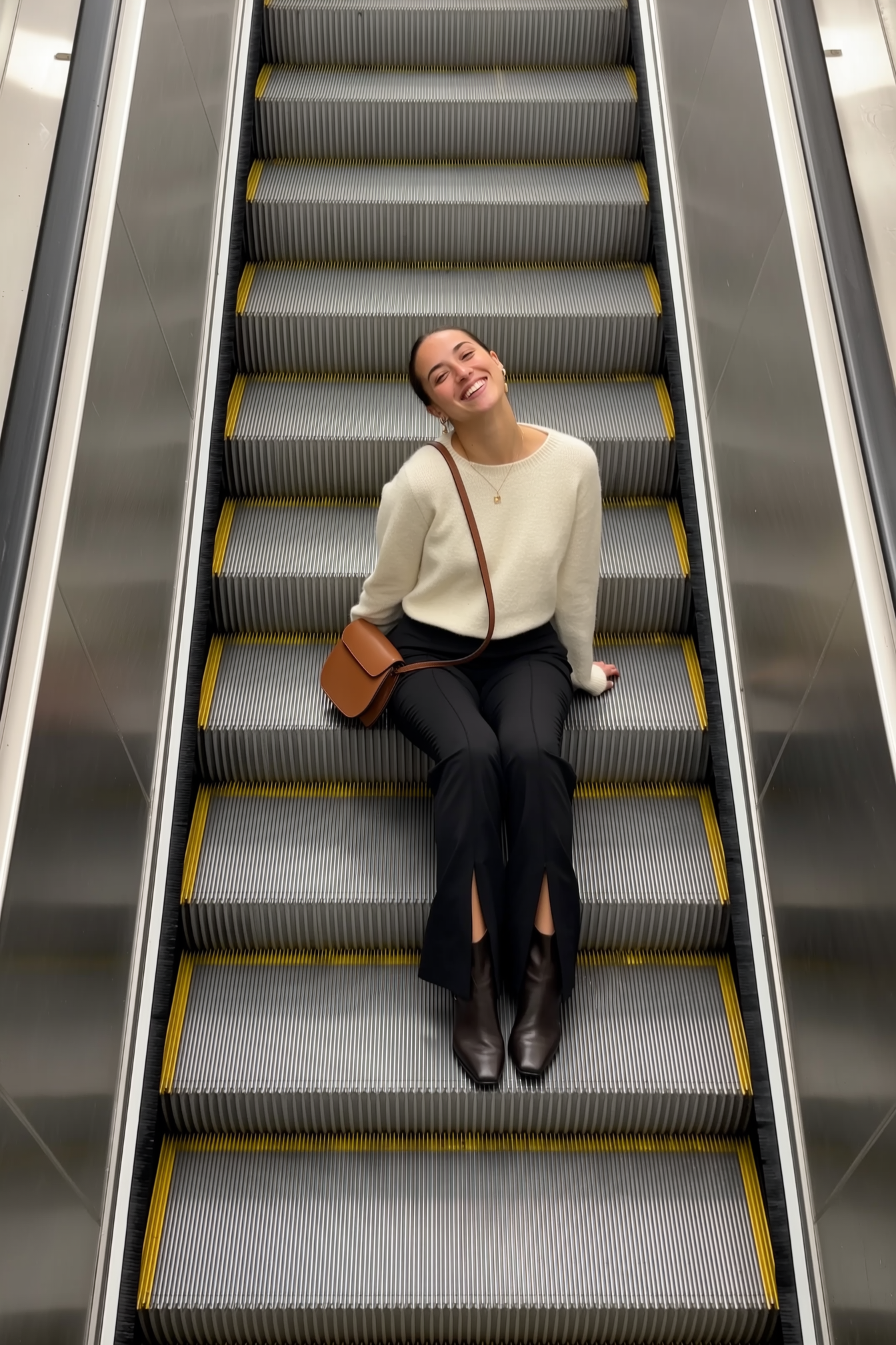 The woman wears a soft, cream-colored cashmere sweater tucked neatly into black culottes featuring subtle side slits, paired with sleek leather ankle boots and a brown crossbody saddle bag resting gently by her side. Her posture is relaxed and natural as she tilts her head back toward the camera with a warm, spontaneous smile. Soft, ambient indoor lighting gently enhances the fine knit texture of the sweater, the smooth leather grain of the boots and bag, and the metallic details of the escalator steps, producing an editorial feel that's stylish yet effortlessly approachable.