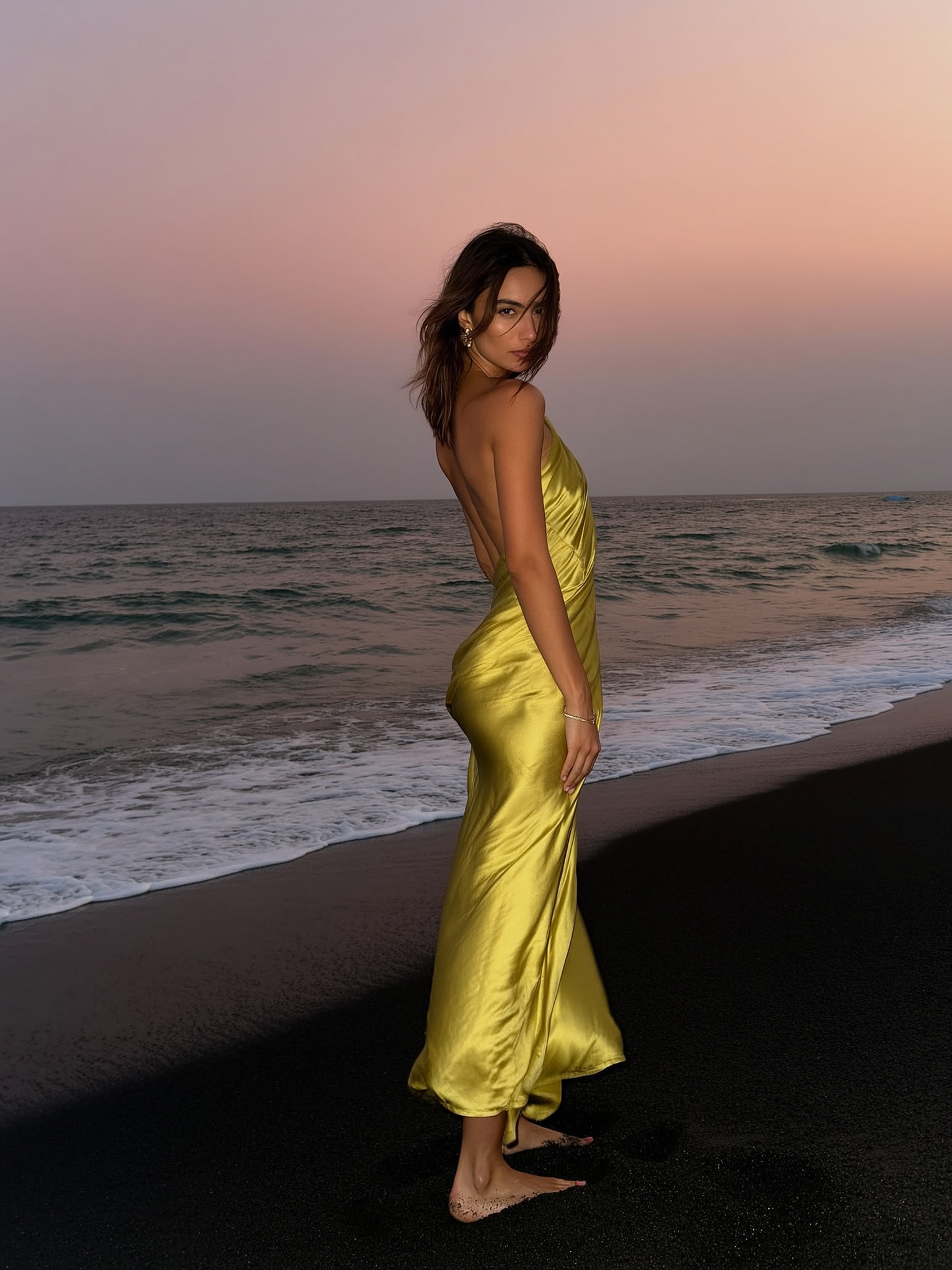 She stands barefoot on dark volcanic sand, the evening tide gently lapping at her feet as the horizon unfolds in muted dusty pink and soft grey hues, the fading sun casting a quiet glow behind her. Her one-shoulder chartreuse satin dress clings and flows with a natural crumple, each fold and sheen brought to life by a gentle iPhone flash that sculpts the fabric's glossy texture with subtle clarity. Facing the vast ocean, her body poised with calm stillness while her head turns slightly toward the camera, eyes meeting the gaze with an arresting, haunting stare. The silhouette is sharp and clean against the dimming sky, skin warmed by the last light, hair softly tousled, embodying a serene elegance that lingers with the soft sea breeze and fading day. —sunset elegant beach snapshot, captured on iPhone.
