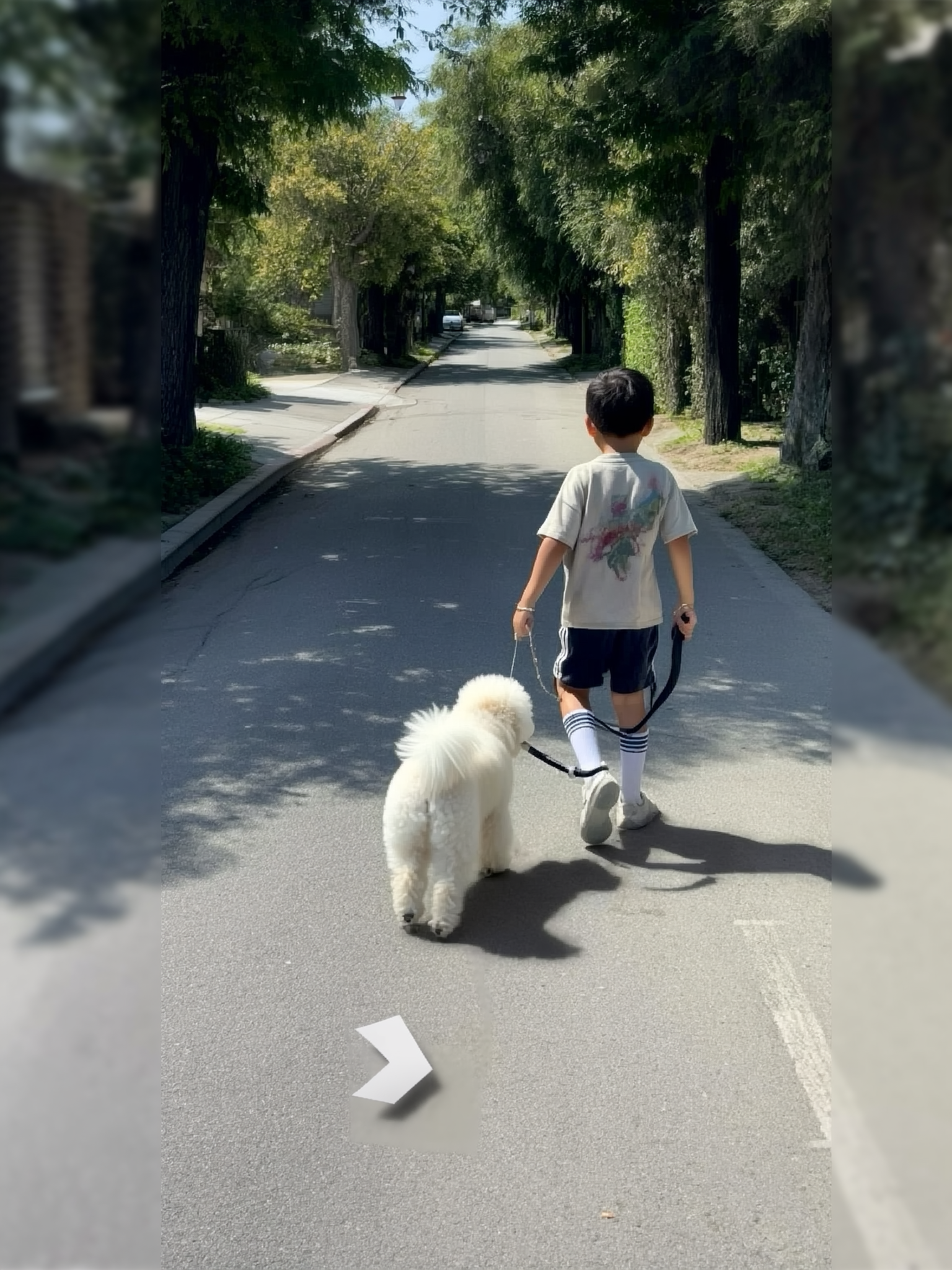 A kid walks a fluffy white dog along a quiet street lined with trees. He wears long socks, a T-shirt, and athletic shorts, holding the leash loosely. The sidewalk curves behind him, and the sun casts sharp shadows from the bushes. A Google Maps arrow floats beneath their feet like it’s leading nowhere.