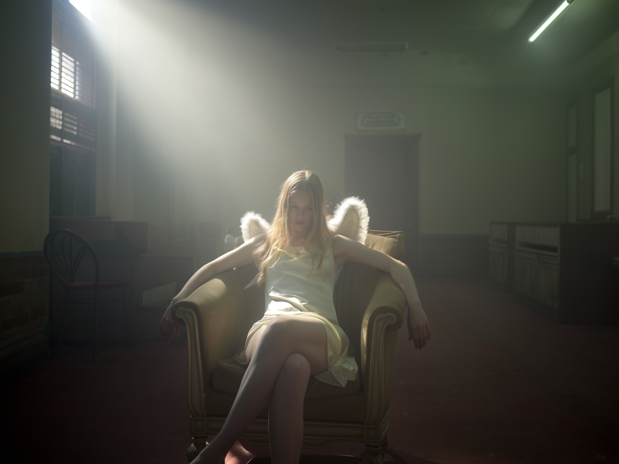 The entire scene is bathed in overexposure, with the young woman’s glowing figure held against deep dimness around the salon’s shadows. Textures vanish into a gentle blur, hair merging with muted light. The tainted atmosphere is quiet, emotionally neutral, as if the image captures a fleeting memory slipping away. Her presence feels ghostlike, slightly distant, weightless within an ambient field of pale ivory and dusk greys, the glowing wings gently diffused into the encompassing haze.