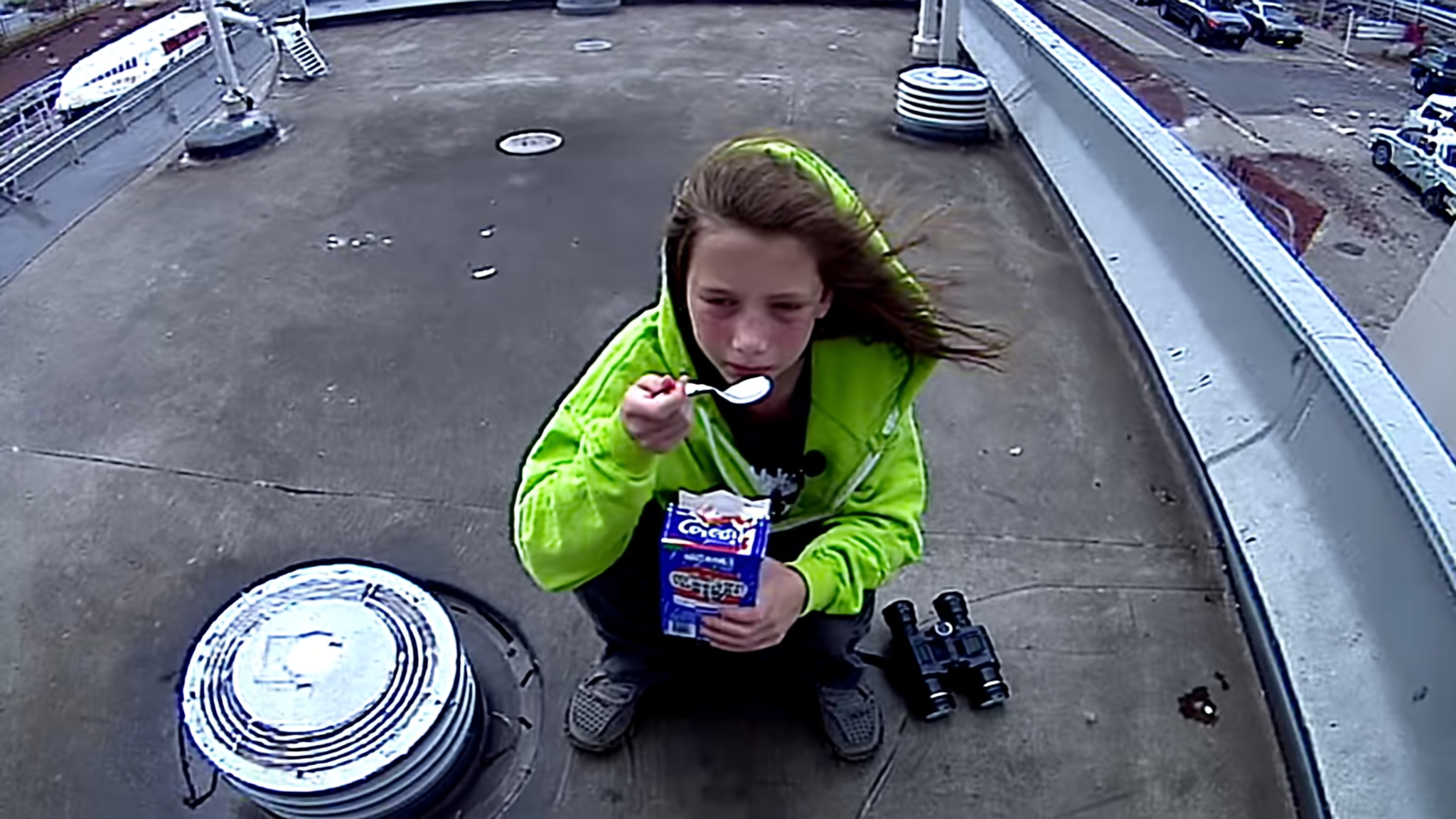 A grainy, blurred top-down CCTV-style shot capturing a teenage girl crouched casually on the flat rooftop of a gas station, wearing a neon green hoodie with the hood partially down, her hair tousled naturally as if blown by wind. She holds a cereal box loosely in one hand while bringing a spoon to her mouth with the other, displaying a relaxed yet focused expression. Beside her, binoculars rest briefly near her face as she surveys the drive-thru area below. The rooftop surface beneath her feet appears weathered with subtle grime and faded corrective paint markings, illuminated by flat, even overhead floodlighting typical of outdoor security cameras, casting minimal shadows and producing slight glare on metal roof fixtures. The scene includes visible rooftop details such as vents and small puddles reflecting the uniform artificial light. Colors are muted and desaturated, leaning toward neutral tones with a slight green tint from the hoodie softened by grain and compression artifacts. The framing is wide and slightly off-center, showing a balanced view of the rooftop and partial surroundings from a high, functional surveillance angle that suggests spontaneous candid observation. The image contains pronounced pixelation, moderate blur, scan lines, and artifacts consistent with authentic CCTV footage, capturing a natural moment without staged composition.