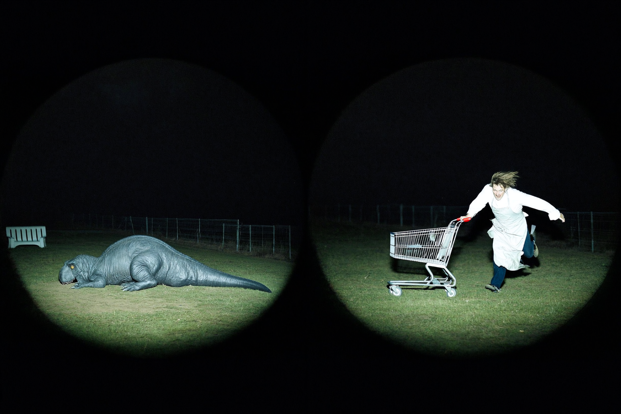 • Description: Left frame shows a person in a giant inflatable T-Rex costume lying flat on the grass; right frame shows a chef in full whites furiously chasing a runaway shopping cart