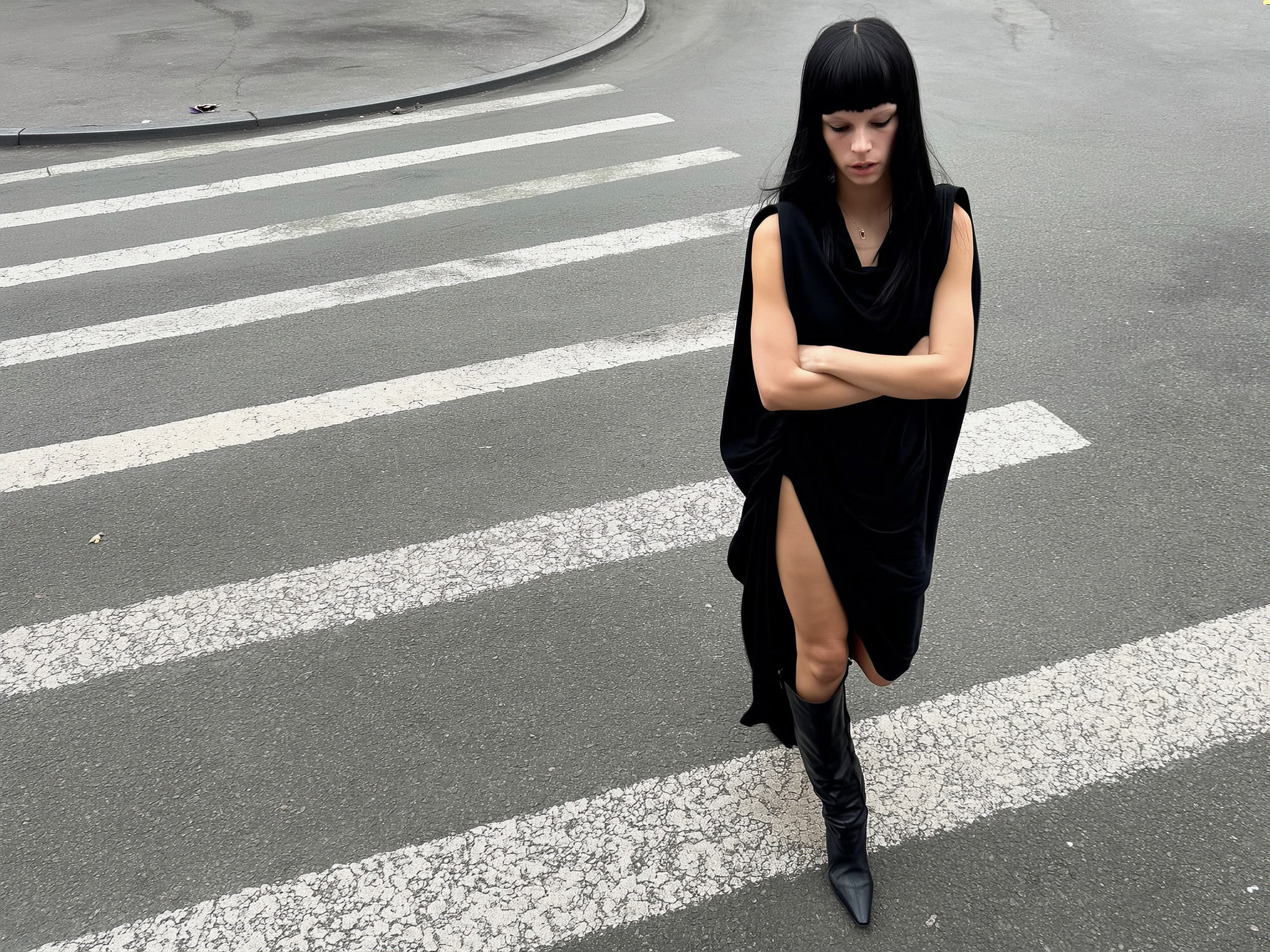 A young woman wearing a dramatic black draped outfit and sharp black boots walks slowly across a pedestrian crosswalk, looking downward with her arms crossed. Her long, straight hair with blunt bangs falls naturally without styling. The setting is a road and pedestrian crosswalk with clearly visible white zebra crossing lines on a textured asphalt surface; no urban or cityscape elements or vehicles are visible. The lighting is natural daylight with subtle overcast shadows and neutral realistic exposure, typical of genuine street surveillance footage. Textural details include visible skin texture on her face, the flowing folds and slight wrinkles of her black draped outfit, subtle scuff marks on her boots, and the rough grain of the asphalt beneath her feet. The wide, high-angle framing is candid and slightly impersonal, characteristic of street surveillance or traffic cameras, with minor framing imperfections like partially cropped feet and slight motion blur on her arms, capturing a completely unposed, natural moment. The overall color palette is muted and natural, reflecting documentary-style realism without any artificial lighting or enhancement. candid street camera photo, high-angle traffic camera shot, documentary-style realism —high-angle shot, wide shot, hyper-real texture fidelity