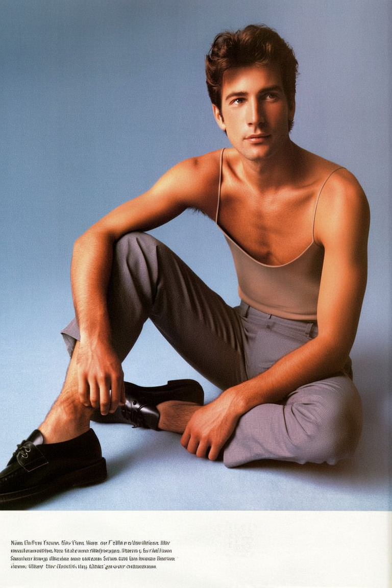 A man is seated naturally against a seamless backdrop of soft muted blue, embodying the 1990s editorial fashion aesthetic with high realism and subtle texture reminiscent of scanned film. He wears minimal fitted basics in a muted, earthy palette—matte textured trousers paired with a simple, sculptural silhouette top in off-white or navy, emphasizing clean lines without stiffness. His feet are adorned with classic black leather shoes exhibiting a minimal glossy finish used sparingly, complementing the understated outfit. His pose is relaxed and unforced, limbs positioned comfortably with one hand resting gently on his knee, showcasing authentic muscle and bone structure without elongation or tension. His skin has a soft velvet matte finish with a natural flush, harmonizing with the desaturated pastel tones of the composition. Hair is styled naturally with a subtle matte texture, free from shine or artificial gloss. Soft, diffuse warm lighting envelops the scene evenly, forming smooth shadow gradations that gently sculpt the figure and fabric textures without harshness or blown highlights. The medium framing balances negative space to highlight the asymmetry of his pose and the natural lines of his form, with a candid gaze directed off-frame conveying quiet introspection. Fine paper grain and a subtle vintage blur overlay evoke tactile depth and the analog editorial print quality characteristic of 1990s fashion imagery. The overall composition exudes restrained elegance and calm minimalism true to the era’s editorial style.