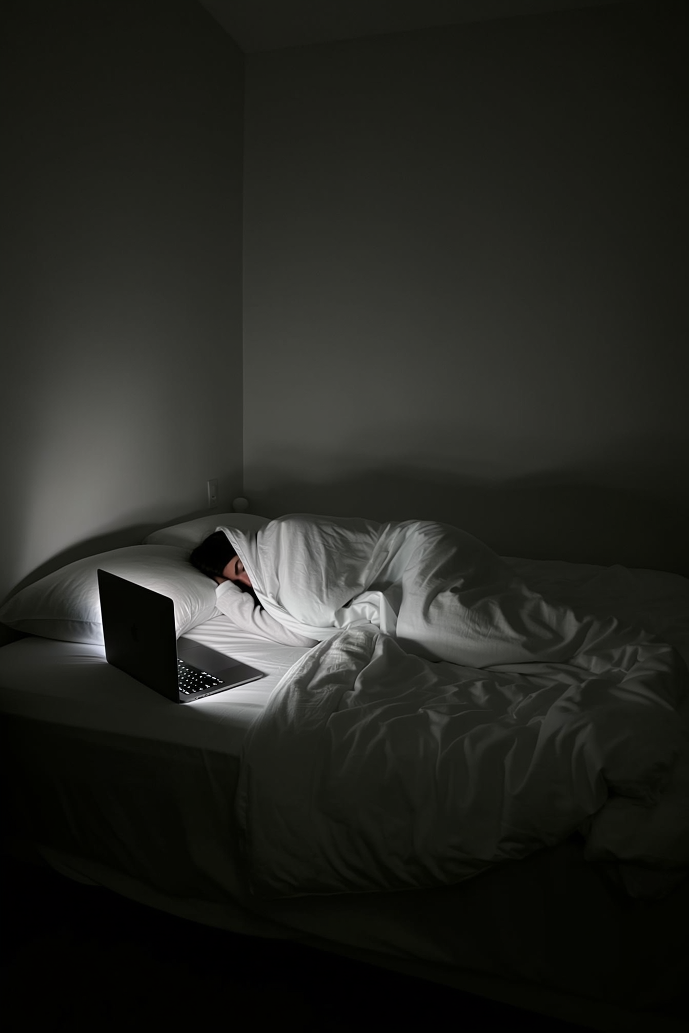 Nighttime bedroom photo, a person wrapped in dark bedding like a burrito, laptop open at edge of bed, faint screen light the only source of illumination.