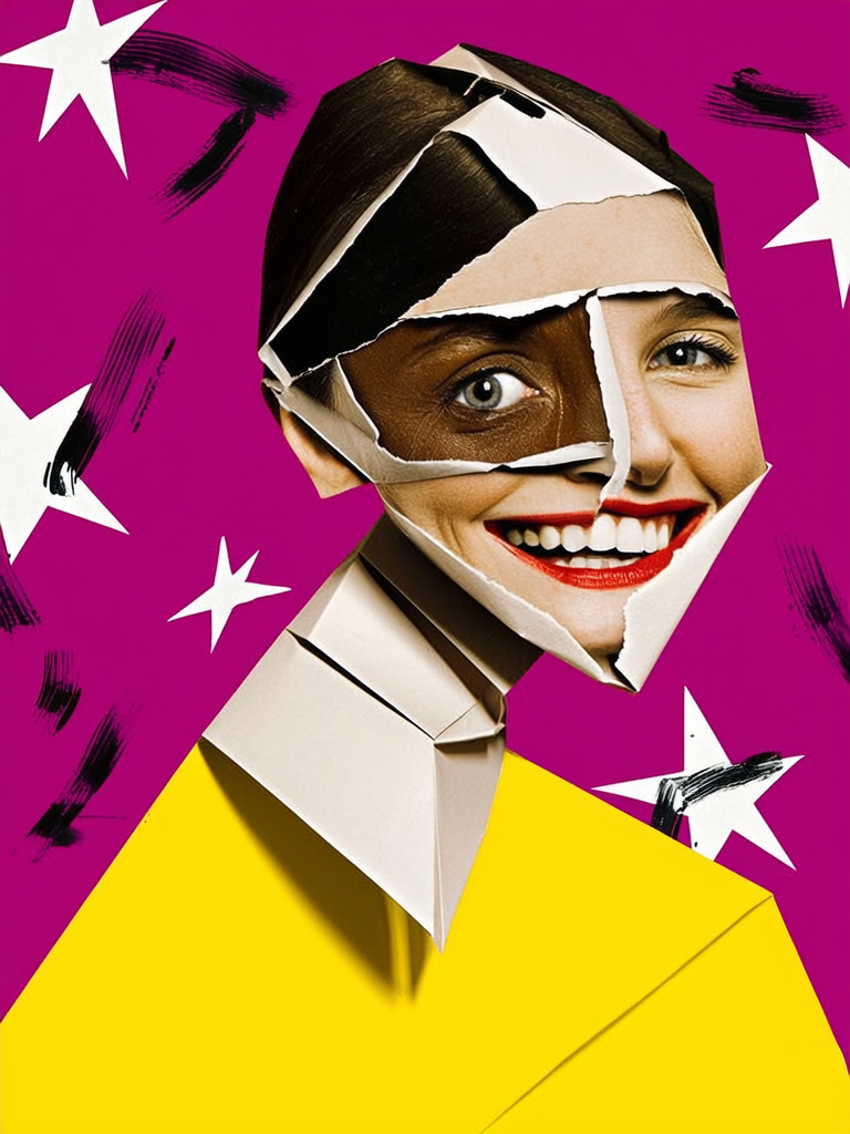 The woman's face and upper body are constructed from uneven, torn paper cut-outs, each segment misaligned and layered with no anatomical consistency. Her eyes are duplicated and offset, one larger and turned upward, the other smaller and shadowed by a darker torn cheek fragment. Her mouth is split into two overlapping smiles, one wide and open, the other subtly curved, forming a fragmented expression of happiness. Creased edges, visible tears, and folded paper areas give her skin a rough, tactile look. Her neck bends sideways awkwardly, composed of stacked paper segments. She wears a bright yellow geometric blouse made from solid angular shapes ignoring natural fabric folds. The background is a vivid magenta field scattered with white jagged stars and black brushstroke marks. Harsh flat lighting slashes across her collage layers, highlighting every folded edge and torn seam. The image is a crude, flat 2D collage with no realistic depth, emphasizing raw emotion and chaotic, surreal construction.