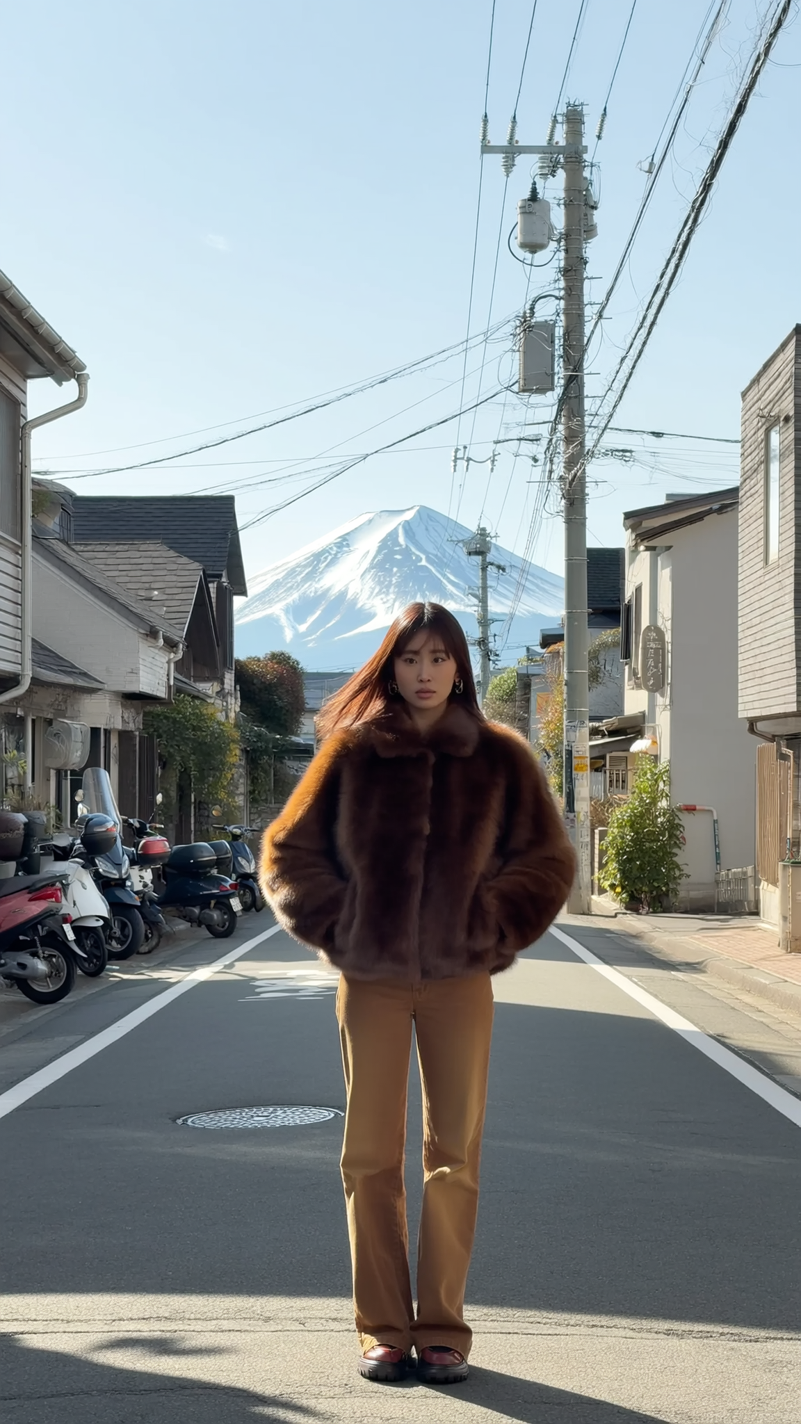 A high-resolution photograph capturing a young stylish woman standing fully still in the center of a narrow Japanese residential street. The frame is symmetrically composed with power lines, parked scooters, and rooftops lining both sides, all leading the viewer's gaze to Mount Fuji perfectly centered and visible behind her. She wears a brown faux-fur jacket that shows detailed texture of the soft fabric, paired with fitted tan pants that fit naturally, accentuating layers and fall of fabric. Her hair is loose, gently tucked behind her ears, with natural movement and shine. Her face is serious and unwavering, looking straight ahead with a thoughtful, editorial mood that resembles a street-style fashion campaign. The lighting is soft and diffused, typical of a bright, cool autumn day, gently illuminating her outfit and skin without harsh shadows. The overall aesthetic is calm, stylish, and modern Japanese, focusing on sincere contemplation amid subtle urban textures and the iconic Mount Fuji backdrop.
