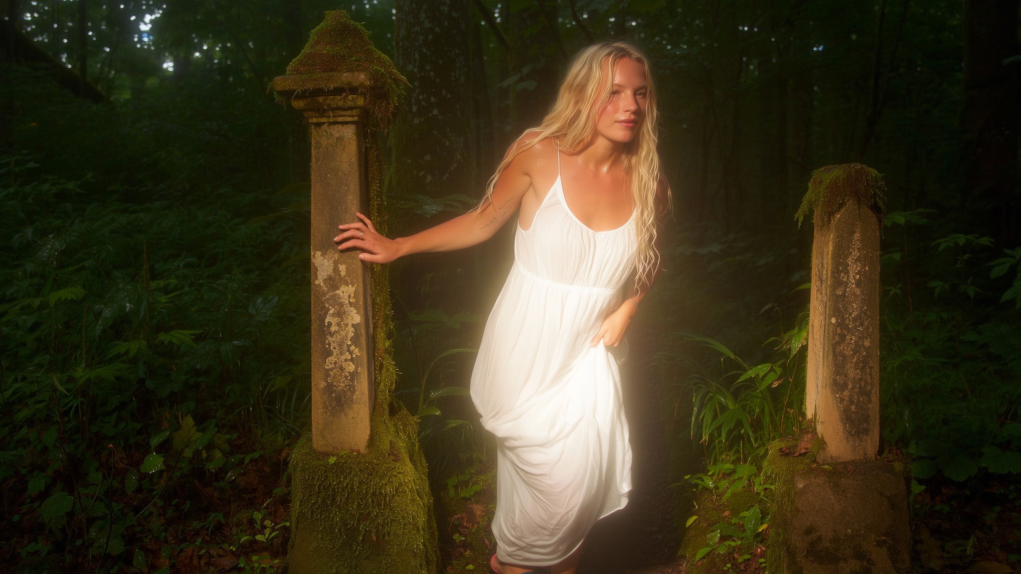 A woman with ethereal blonde hair clad in a softly flowing white dress emits a gentle, radiant white glow that softly diffuses around her figure as she steps naturally between two ancient stone pillars overgrown with glowing moss beside a shadowy dark green forest at dusk. Her pose is spontaneous and uncontrived, bathed in the muted, diffuse warm light filtering through dense, damp foliage above. Her skin displays delicate natural warmth with visible pores and a slight flush from the cool, humid air, while loose strands of blonde hair catch faint glimmers of the dimming light. The deep green leaves and moss shimmer subtly with moisture, enveloped by a thin, ethereal white fog weaving through the scene. The white fabric of her dress wrinkles gently at the folds, adding tangible texture. The image is captured from a casual, slightly angled iPhone perspective, enhanced with soft focus, light haze, and the characteristic warm, diffuse shadows typical of spontaneous forest shade photography at dusk.