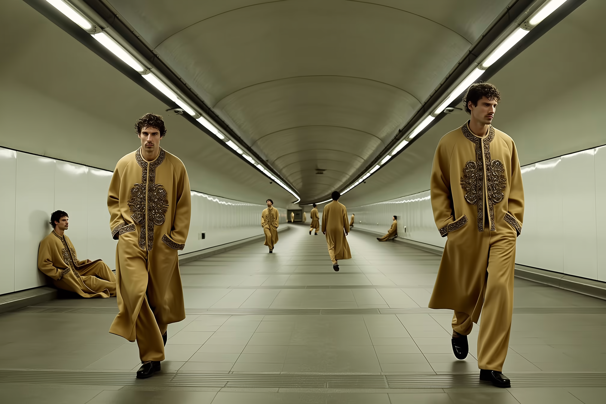 A cinematic and minimalistic surreal image capturing a man duplicated multiple times within a perfectly symmetrical underground pedestrian tunnel. Each figure wears the same bone-colored coat embroidered with heavy intricate detailing and matching loose trousers, appearing in varied natural poses: walking toward the camera, moving away, sitting relaxed against the tunnel wall, and casually turning with hands in pockets. The tunnel’s architectural symmetry frames the scene with strong leading lines that amplify the repetition. Soft natural ambient lighting typical of an iPhone snapshot gently highlights textures of his coat fabric, subtle skin details, and hair strands, casting realistic shadows on the tiled surfaces. Creative perspective blends close-up figures in the foreground with smaller distant versions, producing an immersive yet candid visual narrative. The framing has intuitive casual cropping with slight motion blur, evoking a spontaneous, authentic moment despite the surreal multiplicity.