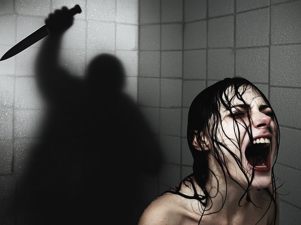 Wet strands of dark hair cling to a young woman's pale, terrified face, her mouth wide open in a silent scream that encapsulates pure horror. Behind her, fragmented by a grainy monochrome haze, looms a shadowy figure cloaked in darkness, arm raised high with a large, glinting knife poised to strike. The tiled shower setting glistens with droplets, cold and sharp, while harsh directional lighting slices through the steam, casting jagged shadows that amplify the atmosphere of dread. Textured with a rich vintage grain, the tight framing ignites intimate dread, juxtaposing soft vulnerability with brutal menace in a masterful study of psychological terror. —moody vintage film grain