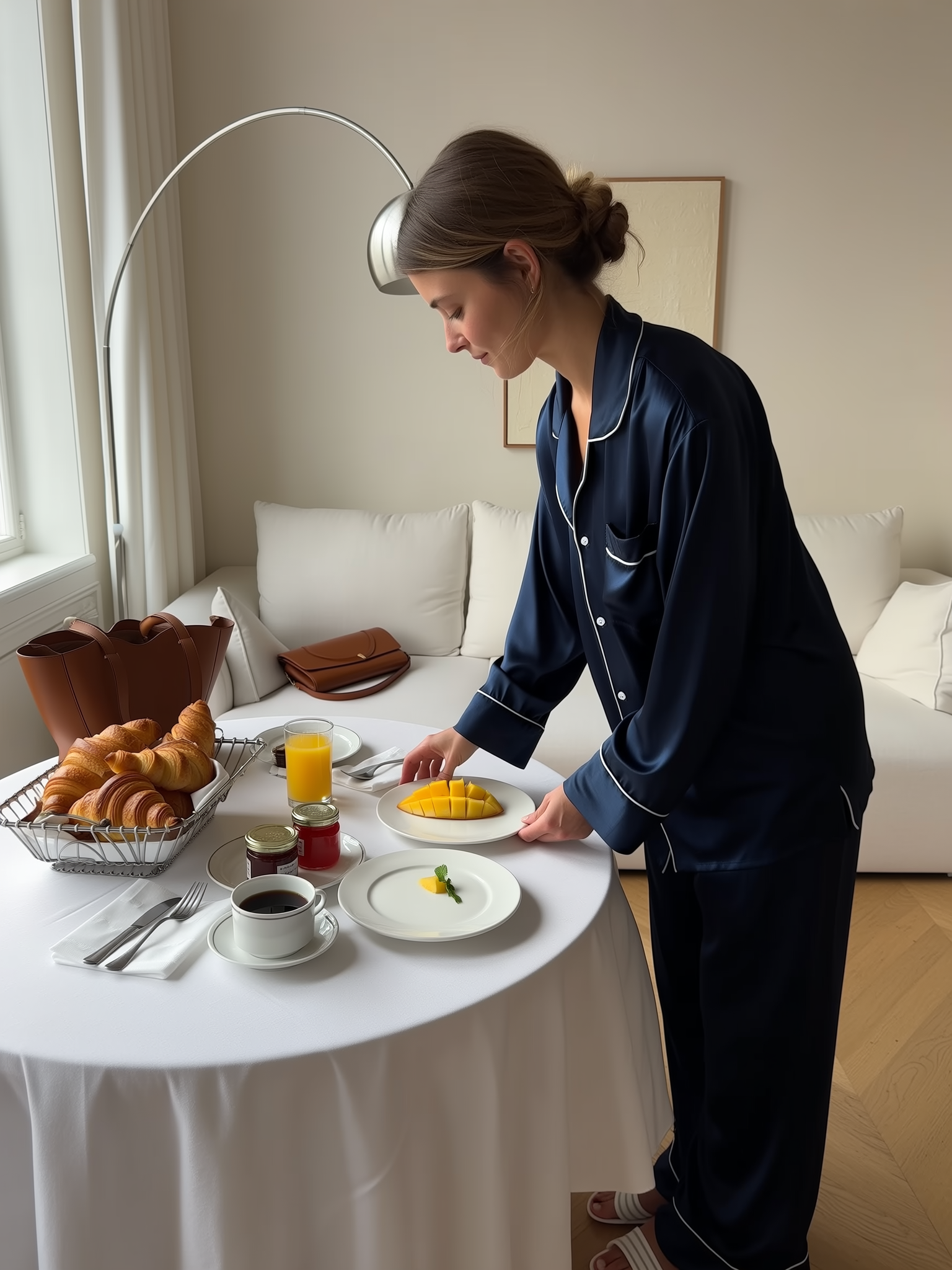 She lounges in deep navy silk pajamas trimmed with crisp white piping, hair softly undone, poised at a round table cloaked in pristine white linen. Her fingers glide over a perfectly plated mango segment beside a tender-green garnish, embodying calm precision as morning light spills gently from an unseen left window, draping the scene in washed-out softness. A woven metal basket brims with flaky croissants and buttery rolls, accompanied by glassware half-filled with fresh orange juice and a black coffee steaming faintly beside tiny jars of butter and jam, styled with minimalist grace. Behind her, a white sofa with sharply aligned cushions rests beneath a modern abstract painting, while a brown leather bag leans carelessly yet curated. An arcing floor lamp bisects the frame vertically, its sculptural form lending quiet architectural interest. The sensor's modest dynamic range softens shadows and highlights, resulting in a tender, tactile oasis of muted luxury, where each creased fold, flake crumb, and gleaming porcelain rim whispers unspoken restraint and deliberate ease. Slight hand tremor and cozy grain impart inviting warmth to this solitary morning ritual.