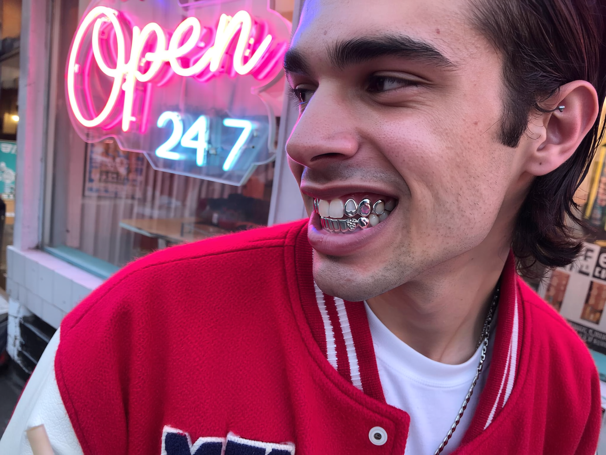 A close-up upper-body shot of a young man with slicked-back dark hair, on his teeth shining a polished set of silver grills that catch the neon pink and blue light from a vintage 1980s-style diner's "Open 24/7" sign, each tooth's smooth metallic surface reflecting intricate details and realistic highlights. He wears a vibrant crimson varsity jacket layered over a clean white tee, the jacket's soft, slightly worn fabric texture visible under ambient dusk lighting. His expression is alert as he glances sideways, holding a milkshake casually in one hand. Soft neon hues bathe his skin’s natural texture and the fabric’s grain, with realistic shadows enhancing the tactile feel. The background shows the softly blurred neon-lit diner facade, framed at a subtle tilt to evoke an intimate, candid iPhone photograph's spontaneous vibe.