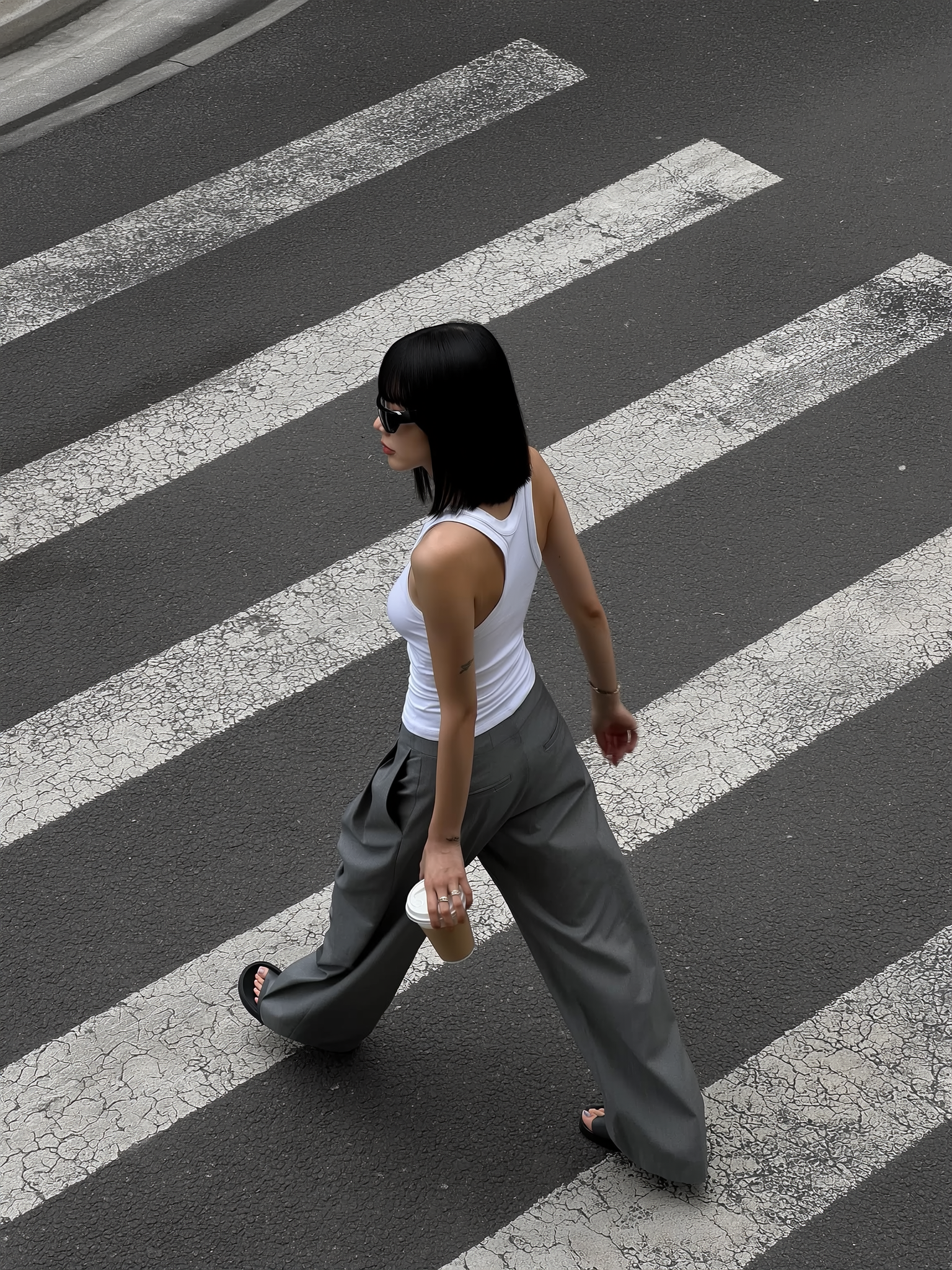 A chic young woman with straight black hair, wearing oversized gray slacks hanging low on her hips and a form-fitting white tank top. She walks calmly across a pedestrian crosswalk, holding a latte in one hand and wearing black sunglasses. The scene is a road and pedestrian crosswalk showing clear white zebra crossing lines on a textured asphalt surface with no urban or cityscape elements visible. The lighting is natural daylight with subtle overcast illumination, casting realistic soft shadows and neutral exposure typical of genuine street surveillance footage. Textural details include the smooth skin texture of her exposed arms, natural straight hair strands, the wrinkled fabric of her gray slacks and crispness of the tank top, reflective lenses of the sunglasses, slight scuff marks on her black sandals, and the coarse asphalt beneath her feet. The composition is a wide, high-angle, candid shot capturing her mid-step with slight motion blur on one arm, framed in a slightly impersonal, documentary style as seen from a street camera. The image maintains muted, natural colors and realistic highlights and shadows without any stylization or enhancements. candid street camera photo, high-angle traffic camera shot, documentary-style realism —high-angle shot, wide shot, hyper-real texture fidelity