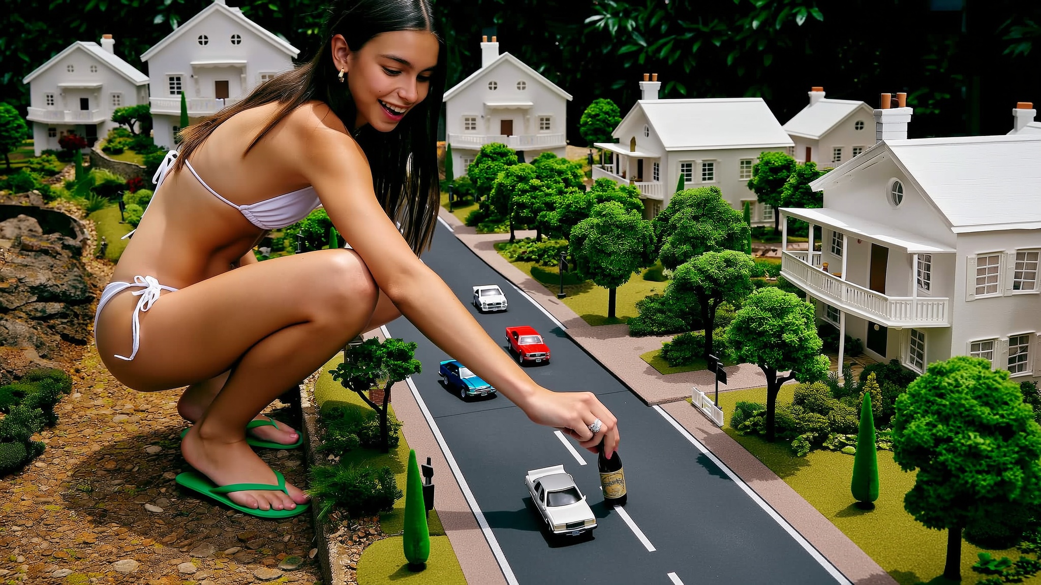 The image shows a young woman wearing a white bikini and green flip-flops crouched down over a miniature town setup. The model town features small white houses, miniature trees, and a road with marked lines, along which toy cars are placed. The woman appears to be interacting with the miniature scene, placing or holding a small bottle on the road. The scene is outdoors with natural light illuminating the area, emphasizing realistic shadows and details on both the woman and the miniature town. The photo is taken from an elevated eye-level angle focused on the woman and the miniature environment. The image has a sharp, high-definition quality with balanced natural lighting and clear details, capturing a playful contrast in scale with a surreal effect.