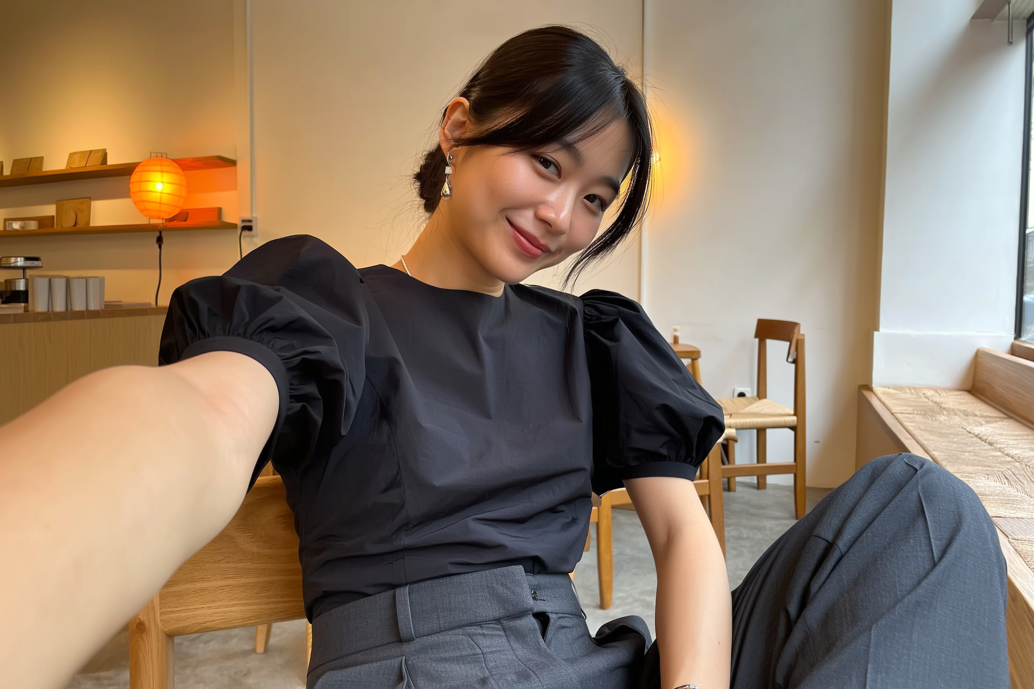 A spontaneously captured iPhone photo featuring a seated woman softly gazing into the camera inside a contemporary Japandi-inspired café. She wears a minimalist black puff-sleeve blouse neatly tucked into structured high-waisted trousers, embodying relaxed elegance with subtle texture contrast. Her understated silver jewelry adds a delicate touch of refinement. Soft natural daylight mixes with the warm ambient glow of an orange lamp in the background, illuminating the cafe's clean lines, warm wood furniture, and minimalist décor including simple shelving and muted textiles. The composition is casually framed with a gentle tilt, evoking warm, cinematic intimacy and authentic candidness. Visible details include realistic fabric grains, natural skin textures with subtle imperfections, loosely styled hair strands, and softly diffused shadows enhancing the genuine iPhone snapshot feel.