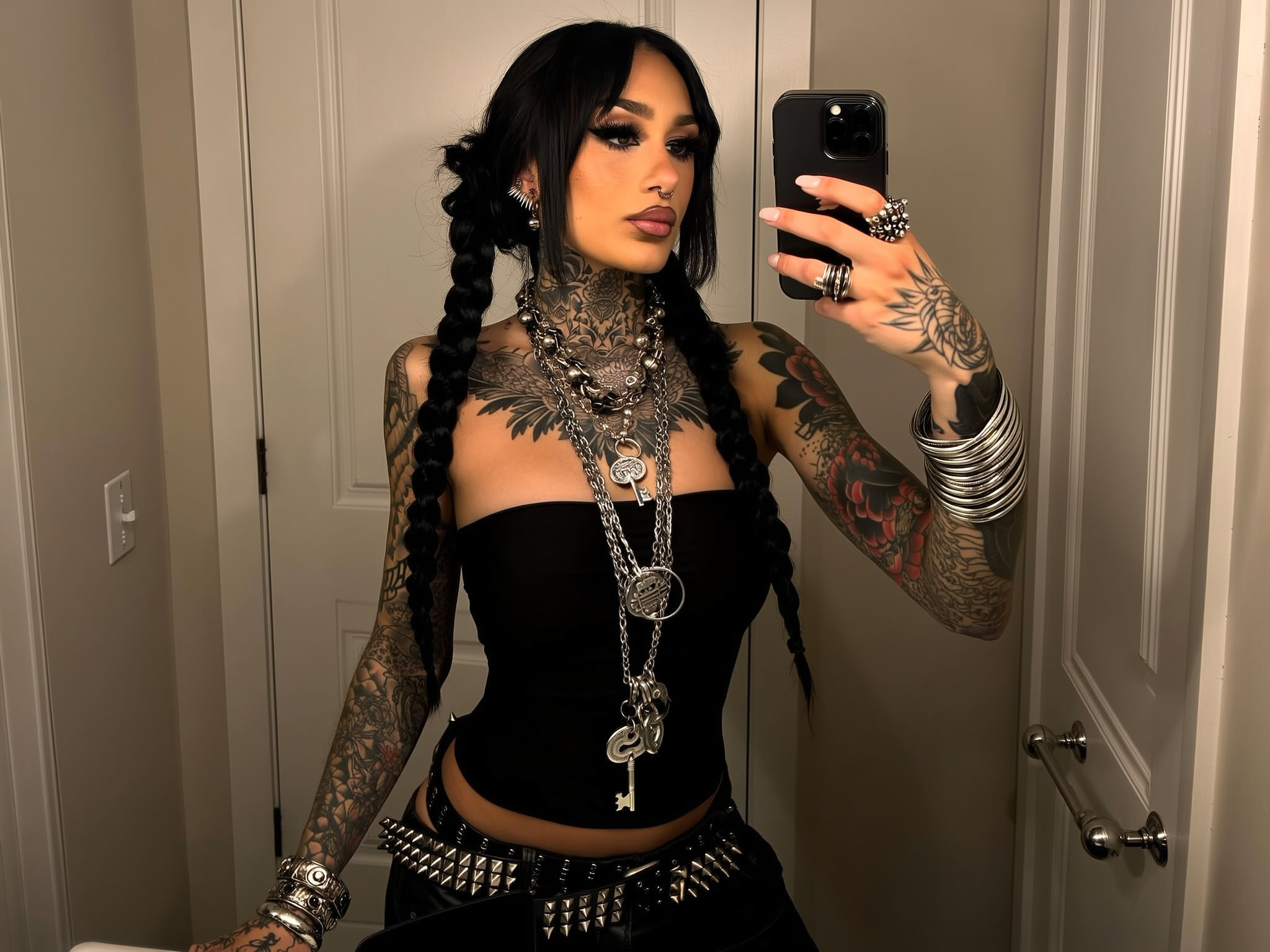 A young woman with jet-black hair styled in two long, messy braids stands taking a mirror selfie in a dimly lit room with white paneled doors. Her skin shows rich detail and texture, fully tattooed across her arms, chest, and neck with intricate floral and ornamental designs. She wears a tight black strapless top and black low-rise pants accented with layered studded belts. Heavy silver jewelry — thick chain necklaces with large key pendants, stacked spiked bracelets, and chunky rings — adorn her. Her makeup is bold: thick black eyeliner, long lashes, and glossy lips. Facial piercings include a septum ring and multiple studs. Warm bathroom lighting softly highlights subtle shadows and natural skin imperfections, giving an authentic, spontaneous iPhone mirror selfie feel.