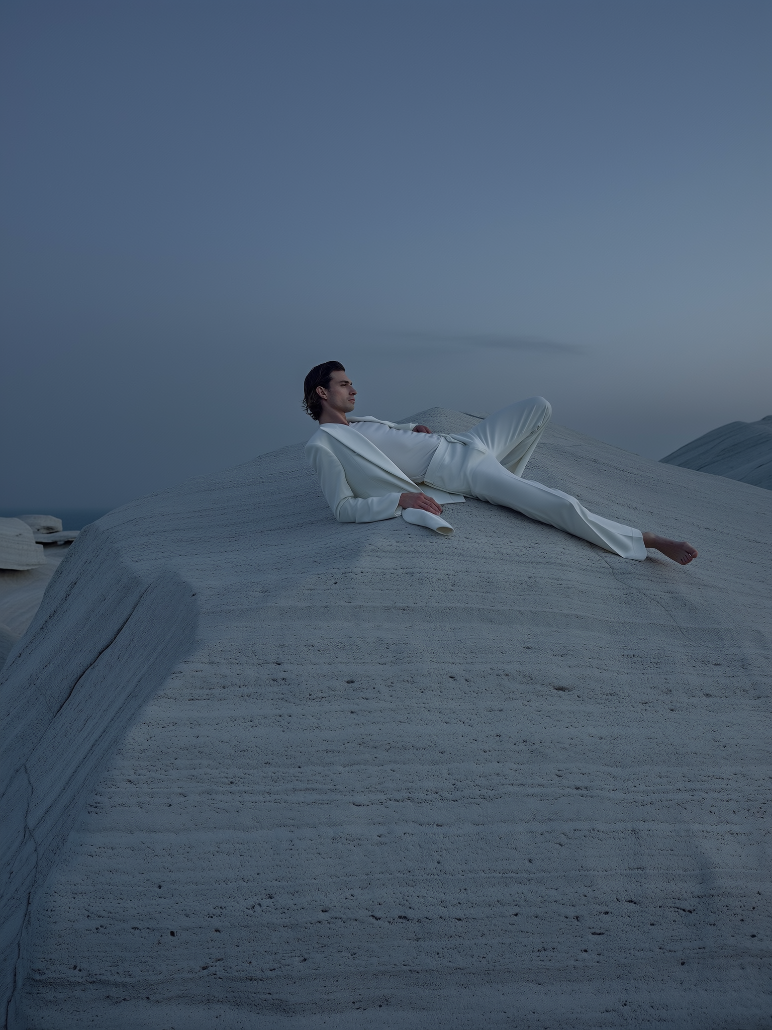 Far-frame, editorial-quality iPhone evening photo of a thin man wearing a long, form-fitting matte white suit, draped thoughtfully to emphasize his slender silhouette. He lies relaxed and unforced atop a massive, cool-toned stone slab with subtle textural details and gentle imperfections, forming a monochromatic Brutalist setting. The background features soft shadows and muted greys blending with dusk-inspired cool blues. His minimalist hairstyle is gently styled, and his expression is calm, introspective, and detached. Soft, diffused twilight lighting envelops the scene in muted gradients of stone grey, shadowy whites, and dusky blues, with subtle matte textile highlights. The far-distance framing accentuates his slender proportions relative to the monumental scale and abstract simplicity of the large rock environment, conveying moody intimacy typical of quiet, dimly lit evening iPhone photography. No direct sunlight.