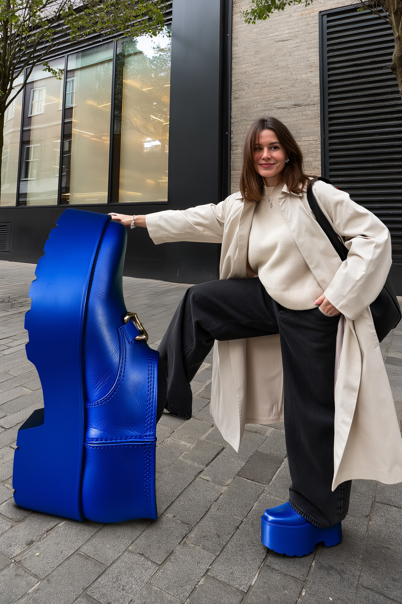 A spontaneous, candid iPhone-style photo of a petite woman climbing a giant cobalt blue platform boot positioned on a picturesque city sidewalk, styled as an urban sculptural landmark. She wears the exact same cobalt platform boot in standard size on her right foot, visible with detailed leather texture, subtle creases, and glossy finish. Her fashionably casual outfit features a light beige trench coat over a soft knit cream sweater, slim black jeans with natural folds, and minimal silver jewelry. The boutique backdrop displays large glass windows framed by sleek matte black metal, subtly reflecting soft daylight. Natural outdoor daylight filters gently through nearby trees, casting soft, nuanced shadows on the textured stone pavement and boutique facade. The image captures skin texture with visible pores and fine hair strands, detailed fabric weaves on clothing, and realistic leather grain on the boots. The photo is informally composed with a slight tilt, the boot and woman off-center, evoking a candid, spontaneous iPhone snapshot blending surreal scale with natural urban elegance.