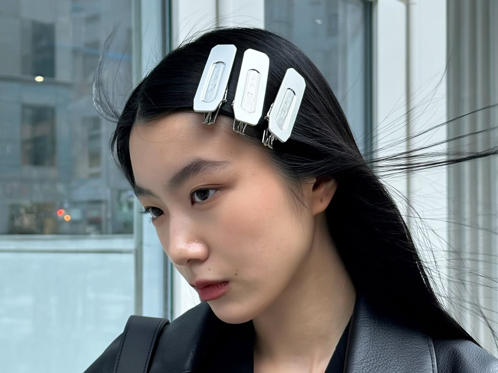 Pristine white rectangular clips line up perfectly above the ears, their sharp edges catching the icy café window glow as a young woman with jet-black straight hair offers a calm, focused stare. The clean contrast between the matte clips and sleek strands frames her clear glass-skin glow, while stray fly-aways soften the calculated feel. A soft leather lapel grazes her neck, minute grain evident, and the shot tilts subtly left, hinting at a high-angle stretch; city pavement blocks faintly blur behind, grounding the cool minimalism in everyday life—authentic iPhone close-up, statement hair-clip focus
