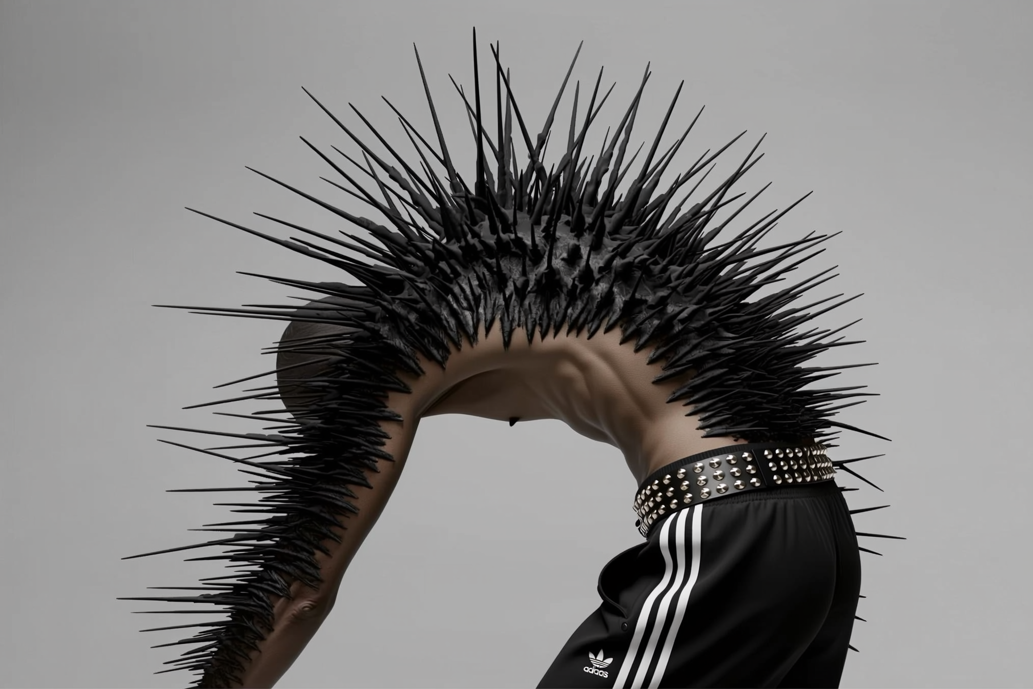 A humanoid figure with a surreal biomechanical mutation — their entire upper body covered in hundreds of sharp, irregular black spikes protruding from the skin like hardened organic armor. The back and shoulders feature a denser concentration of long, needle-like spines, giving a threatening silhouette. The figure is dramatically arching backward in a stylized pose, wearing iconic black Adidas track pants with white stripes and a wide studded leather belt. The background is neutral gray, evoking a high-fashion editorial with dystopian, cyber-organic horror elements. Soft spotlighting enhances the contrast between human flesh and alien texture.