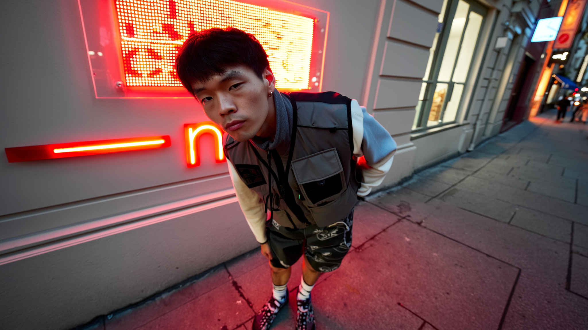 A dynamic, wide-angle iPhone-captured photograph features a young man leaning slightly forward with one hand casually in his pocket, his face bearing a tight, observant neutral expression. His sharply defined jawline is artfully highlighted by urban shadows, with lips gently sealed. He sports a creatively styled layered nylon vest featuring subtle tonal contrasts and functional detailing, paired with loose-fitting tech shorts designed with innovative textile textures distinct from any examples. His footwear includes uniquely mismatched socks adding a playful yet original touch. Behind him, the street scene glows softly under a vivid red LED sign spelling an abstract partial word “—end—”, casting gentle neon reflections onto nearby surfaces. The urban environment includes textured sidewalks and subtly illuminated building facades adding layered depth. Natural ambient evening light combined with the neon glow creates realistic, soft contrasts and shadowing. The image is framed with elevated camera angle and notable wide-angle distortion typical of spontaneous iPhone photography, emphasizing his engaged pose and direct eye contact with the lens, capturing authentic casual urban style and atmosphere.