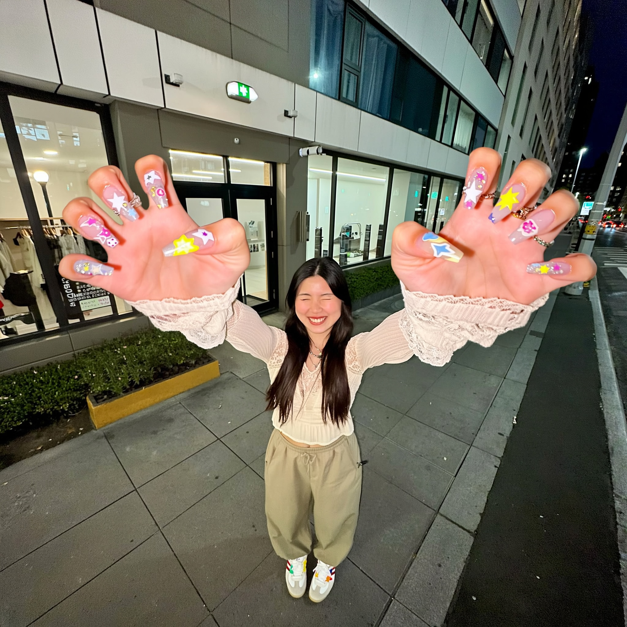 The image features a young woman standing on a sidewalk at night in an urban setting, with a building entrance and large windows behind her. She is wearing a cream-colored long-sleeve top with loose sleeves, beige loose pants, and white sneakers with colorful details. The woman is holding her hands close to the camera, showcasing long, multicolored nails adorned with various playful designs such as stars and other shapes. She has long dark hair and is smiling with one eye closed, giving a cheerful expression. The photo is taken from a high angle with a wide-angle lens, resulting in a slight fisheye distortion that exaggerates the size of her hands near the camera. The lighting is a mix of natural streetlight and indoor light visible from the building, with clear focus and moderate sharpness. The composition emphasizes the vibrant nail art using a shallow depth of field effect that highlights the hands against the urban background.
