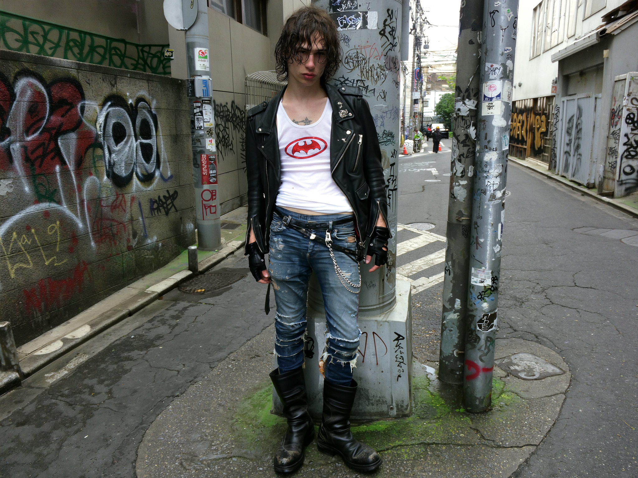 A slim young man stands against a graffitied utility pole on a cramped Tokyo backstreet, framed in a mid-close candid iPhone shot with a relaxed, off-center composition that crops just below his boots. His messy, damp curls fall unevenly around a pale face marked by subtle skin texture and slight redness. He wears a tight white tank top stretched slightly across his chest, emblazoned with a faded red bat logo, layered under an open black leather biker jacket with silver zippers and worn creases. His distressed skinny jeans, patched with fraying denim and held together by safety pins, sag low on his hips, a tangled metal chain swinging from a belt loop. Fingerless black gloves cover his hands, which display faint tattoos creeping across knuckles and wrists.