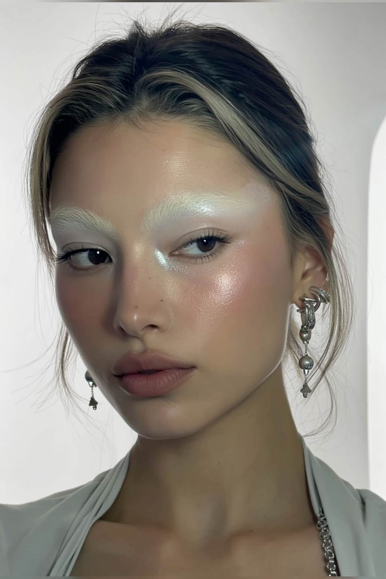 A close-up, authentic iPhone selfie-style portrait of a young woman with naturally bleached eyebrows softly blending into her skin, showcasing sculpted cheeks with subtle shimmering highlight that adds dimension. Her makeup remains natural with muted matte lips and minimal eye makeup emphasizing faint icy or silver tones. The lighting is sterile and soft, casting gentle, diffused shadows that highlight the shimmer on her skin while keeping the overall mood calm. She gazes neutrally but engagingly into the camera, her hair naturally framing her face. The background is a smooth, seamless white environment without visible corners, evoking a minimalist, modern aesthetic akin to a softly lit white cube. She wears a simple, light-colored top with understated silver accessories, reinforcing the effortless and contemporary vibe of the iPhone selfie.