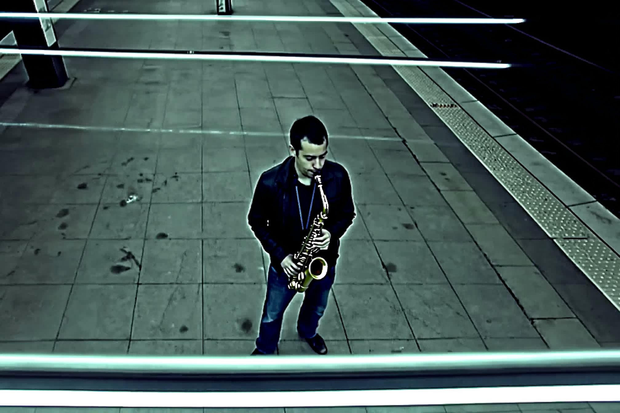 A grainy, blurred top-down CCTV-style shot of a man in casual dark clothing playing a saxophone alone on a dim subway platform. He wears a slightly rumpled jacket and jeans, his hair short and natural, with a focused but relaxed expression as he stands near the edge of worn concrete tiles. The platform floor beneath his feet shows scuff marks, faint stains, and subtle texture details softened by video grain. Flat, uneven fluorescent lighting flickers overhead, casting minimal shadows and bathing the scene in a harsh, clinical glow typical of subway surveillance cameras. The image includes pronounced grain, compression artifacts, moderate blur, and muted, desaturated colors leaning toward cool, neutral tones. The framing is top-down and slightly off-center, capturing the man’s full upper body and parts of the surrounding platform, emphasizing the solitary ambiance within the utilitarian, observational style of CCTV footage.