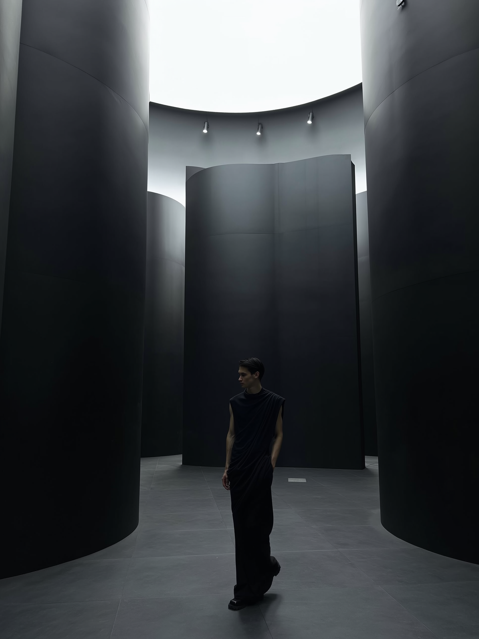 Far-frame, editorial-quality iPhone evening photo of a thin man dressed in a long, form-fitting matte black ensemble with subtle relaxed drapery emphasizing his slender silhouette. He stands calmly and detached inside a vast Brutalist interior characterized by evenly spaced, massive black wide cylindrical structures surrounding him. The setting's cold, geometric brutalist concrete with its muted greys and charcoals envelops the scene gently illuminated by soft, diffused spotlights casting subtle, shadowy highlights and cool dusk-inspired gradients. His minimalist hairstyle is tidy and understated, his expression neutral and introspective. The far framing accentuates his delicate proportions relative to the monumental black cylinders and the spacious brutalist room, evoking an intimate, quietly moody atmosphere typical of casual, dimly lit iPhone photography. The color palette remains strictly muted—deep blacks, cool concrete greys, and shadowy charcoals—avoiding any direct sunlight or harsh lighting.