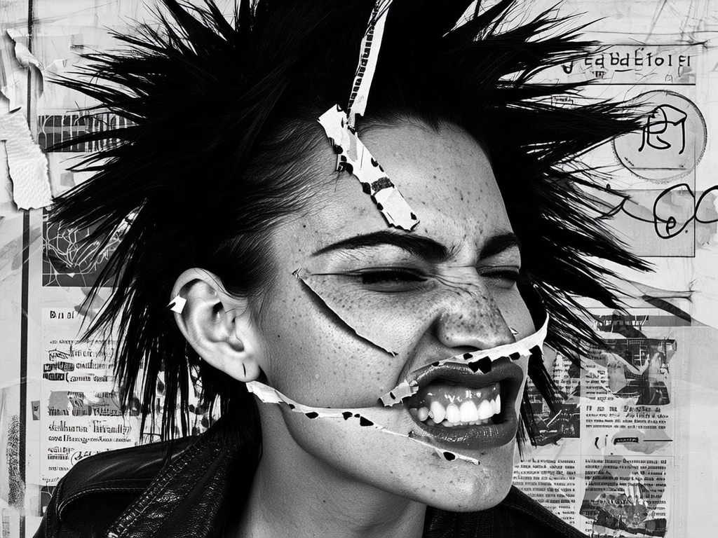 Her face fractures into anarchic layers—one eye duplicated and placed askew above the temple, the other rotated outward with a jagged paper edge. Two mouths overlap unevenly on the lower cheek, one snarling open with a torn lip, the other pressed tight, displaced near the jawline. Her nose splits diagonally, the bridge doubled and staggered, flanked by opposing ears cut with rough scissors and pasted unevenly. Collage seams peek through, masked by frayed tape strips and scattered halftone dots, invoking a hand-cut punk flyer ethos.