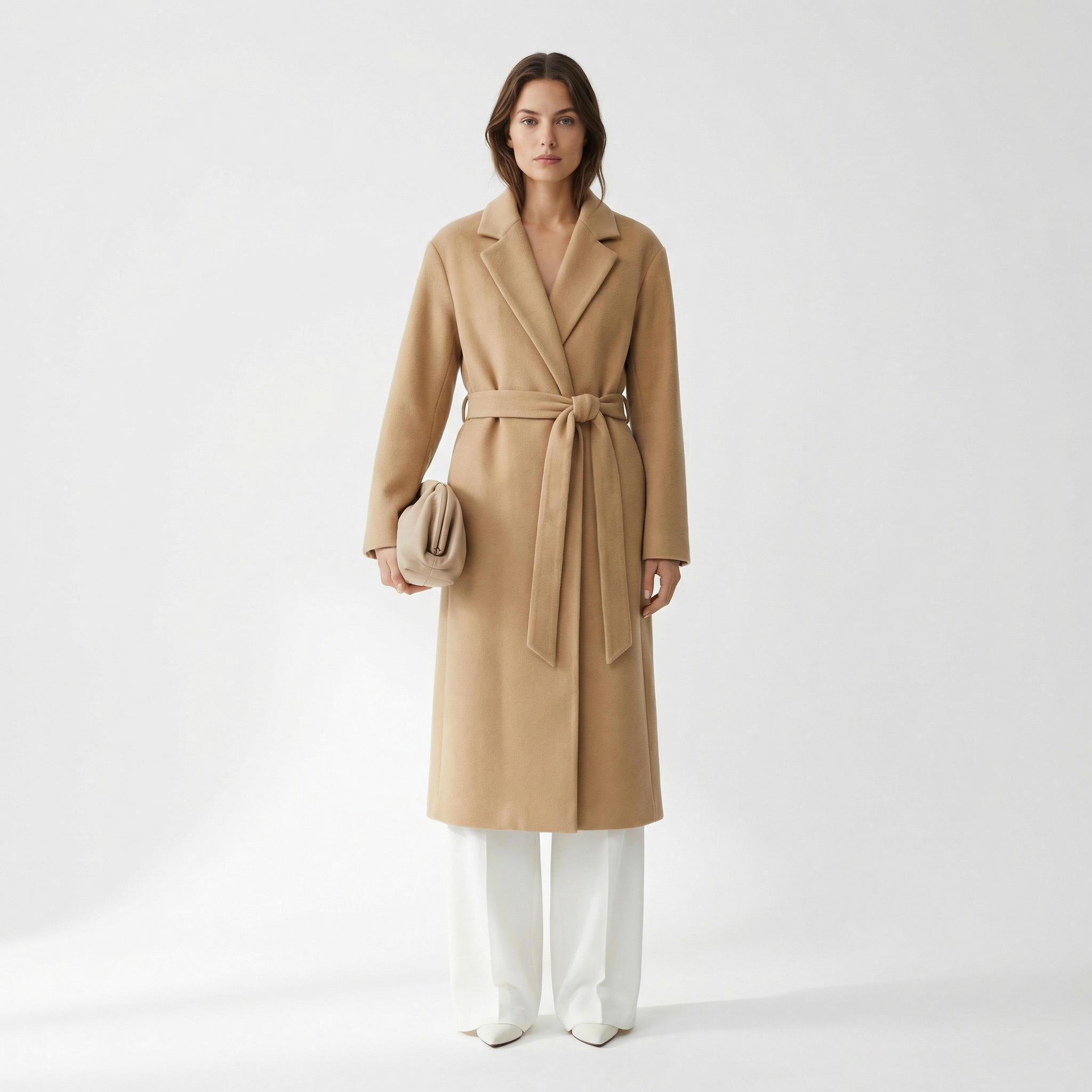 A highly detailed, photorealistic fashion photograph of a beautiful woman model with brown hair, slim athletic build, full-body front view fully visible on the floor, entire height captured completely without any cropping, wearing the exact clothing item from the provided product reference image fitted perfectly on her body as the focal outfit, soft natural lighting, seamless plain white studio background, ultra-high resolution, sharp focus, no distortions, no text or logos.