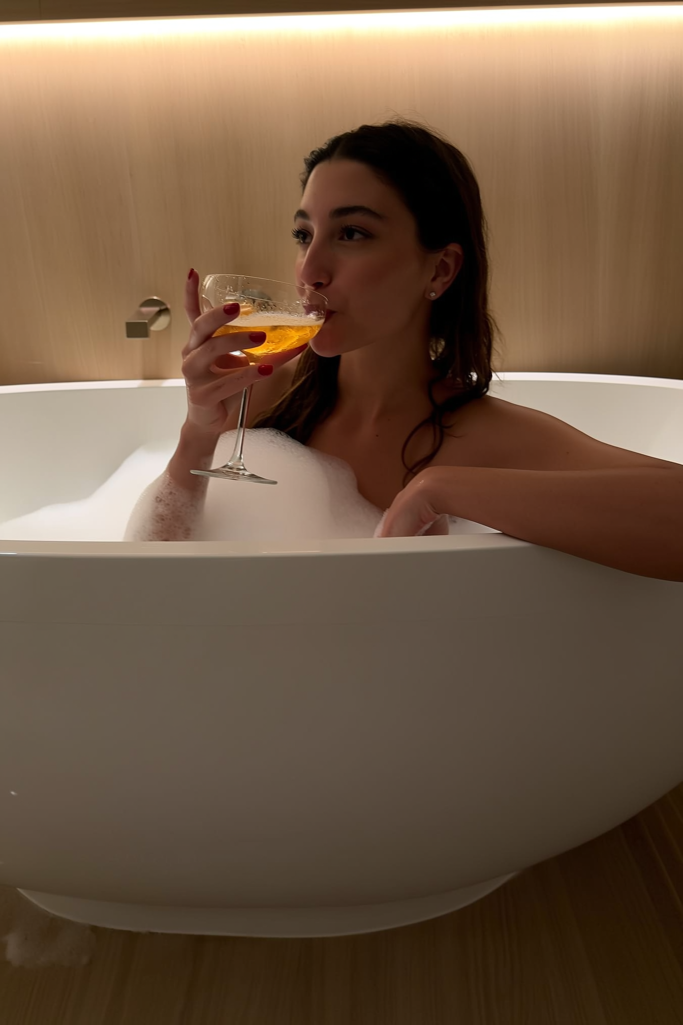 12. A woman sips from a cocktail glass, partially hidden under dense foam, resting one arm along the edge of a modern bathtub. Intimate warm lighting. iPhone photo.