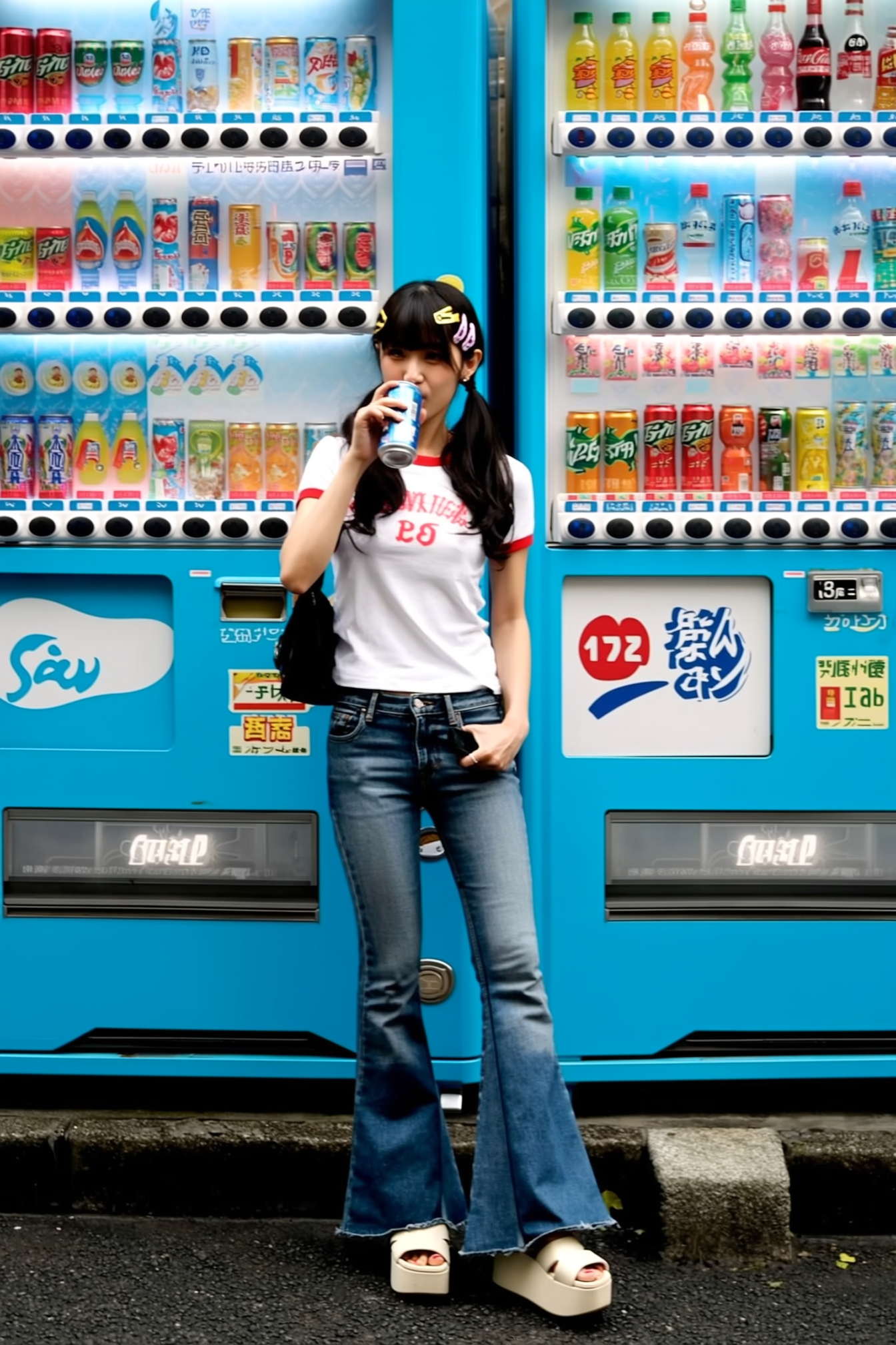 8. Standing next to a vending machine full of colorful drinks, a Japanese woman in a white ringer tee, flared light jeans, and platform sandals leans casually while drinking from a can. Her hair is in pigtails with cute hair clips. iPhone camera look, realistic Tokyo vibe.
