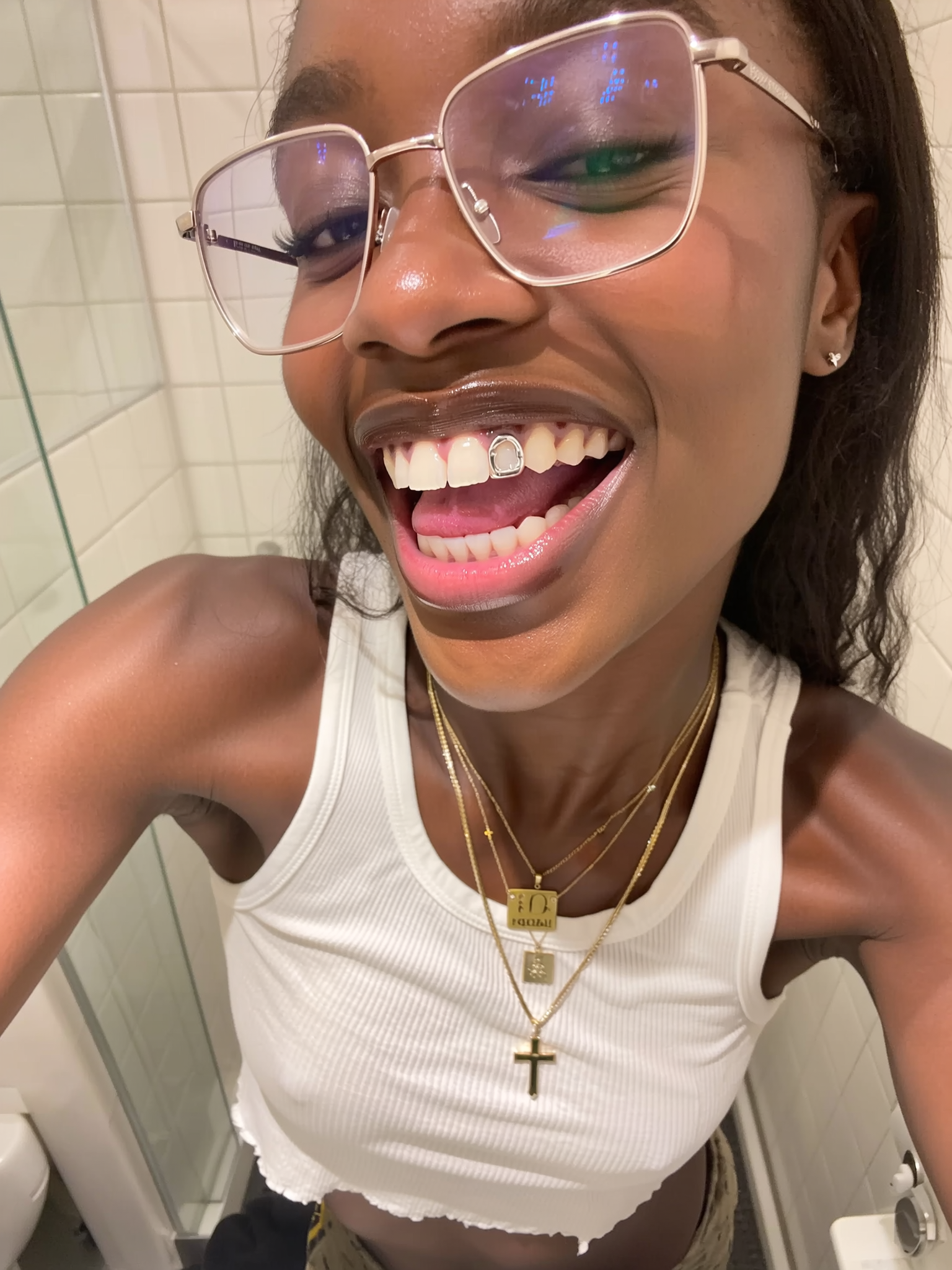 A close-up upper-body shot of a young woman with dark brown skin, her head tilted slightly as she beams a wide, joyful smile revealing on her teeth a single silver grill that gleams with a reflective metallic sheen, catching soft highlights and delicate engravings that emphasize its smooth, detailed surface under warm bathroom lighting. She wears a crisp white cropped tank top, showcasing the fabric's fine weave and softness, layered with gold necklaces—a cross, a locket, and a custom nameplate—that shimmer gently with subtle natural reflections. Her large translucent square-frame glasses catch a soft shine, complementing her glossy lips with a natural, soft glow. The softly blurred bathroom tile background is evenly lit with minimal shadows. The image is framed as a tight, high-angle selfie with slight fisheye distortion and partial cropping, conveying the carefree, spontaneous vibe characteristic of genuine iPhone photography.