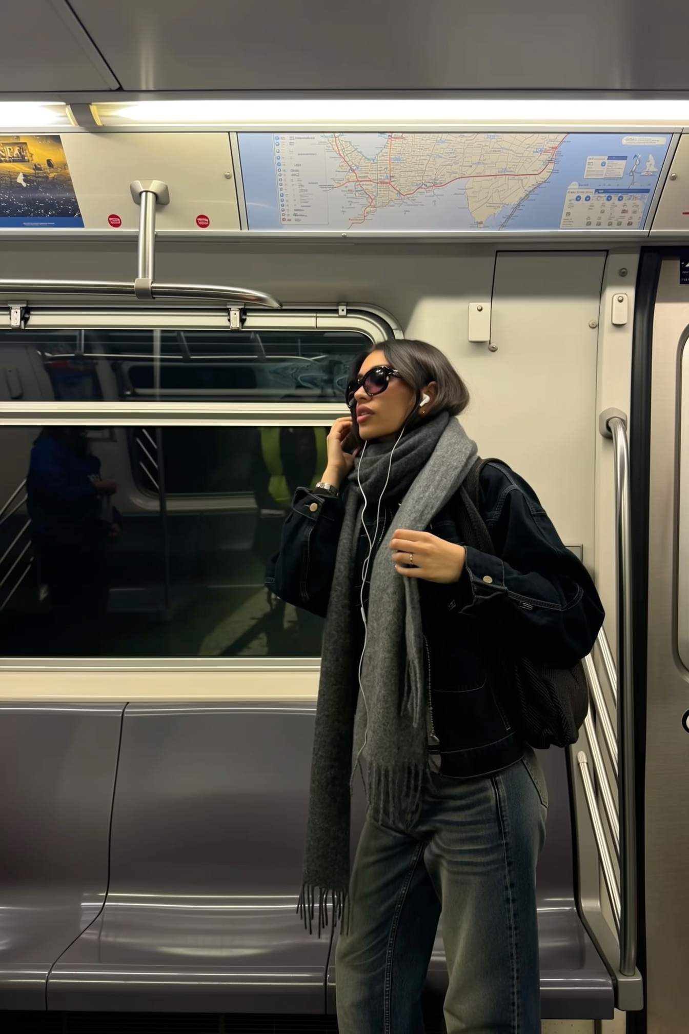 A candid iPhone photo inside a subway car captured from the side wall perspective, featuring a fashionable young woman standing in front of muted matte fabric seats. She wears an oversized scarf and large sunglasses, holding onto a handrail with one hand and delicately adjusting her earbuds with the other. Her layered, casual streetwear style includes jeans. Above her head, a framed, clear subway map is visible. To the right edge, the subway door is subtly included. The dark subway tunnel is seen through the window with soft reflections and gentle interior light glare. The scene is softly lit with diffused subway lighting, highlighting her natural pose and detailed textures of her scarf and denim.