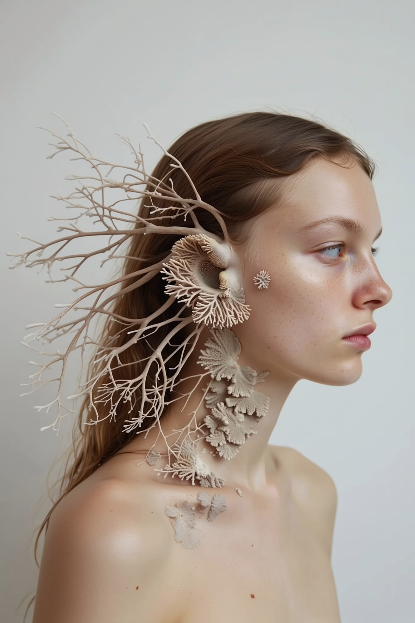 A woman with branching coral growths replacing her ears, natural coral textures fused into skin