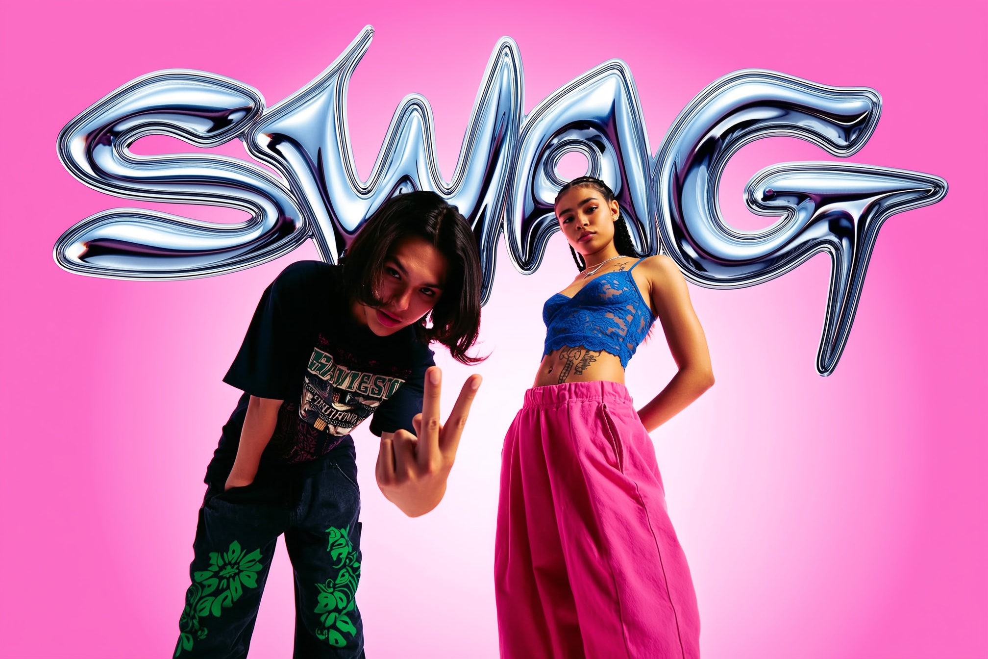 The image features two young individuals posing against a solid pink background. The person on the left is bending forward toward the camera, making a hand gesture, wearing a black graphic t-shirt and dark pants with green floral patterns. The person on the right is standing upright and is dressed in a blue lace crop top and oversized pink pants, with visible tattoos on the torso. Above them is a large, metallic, distorted text element spelling "SWAG" that dominates the upper portion of the image. The lighting is bright and even, producing a high-definition digital look with a slight vignette effect around the edges. The camera angle is a low-angle shot looking slightly upward at the subjects, with a shallow depth of field that keeps the subjects sharply in focus while the text and background are softly rendered. The image uses strong contrast and vibrant colors, emphasizing a modern, edgy aesthetic with artistic typography integration.
