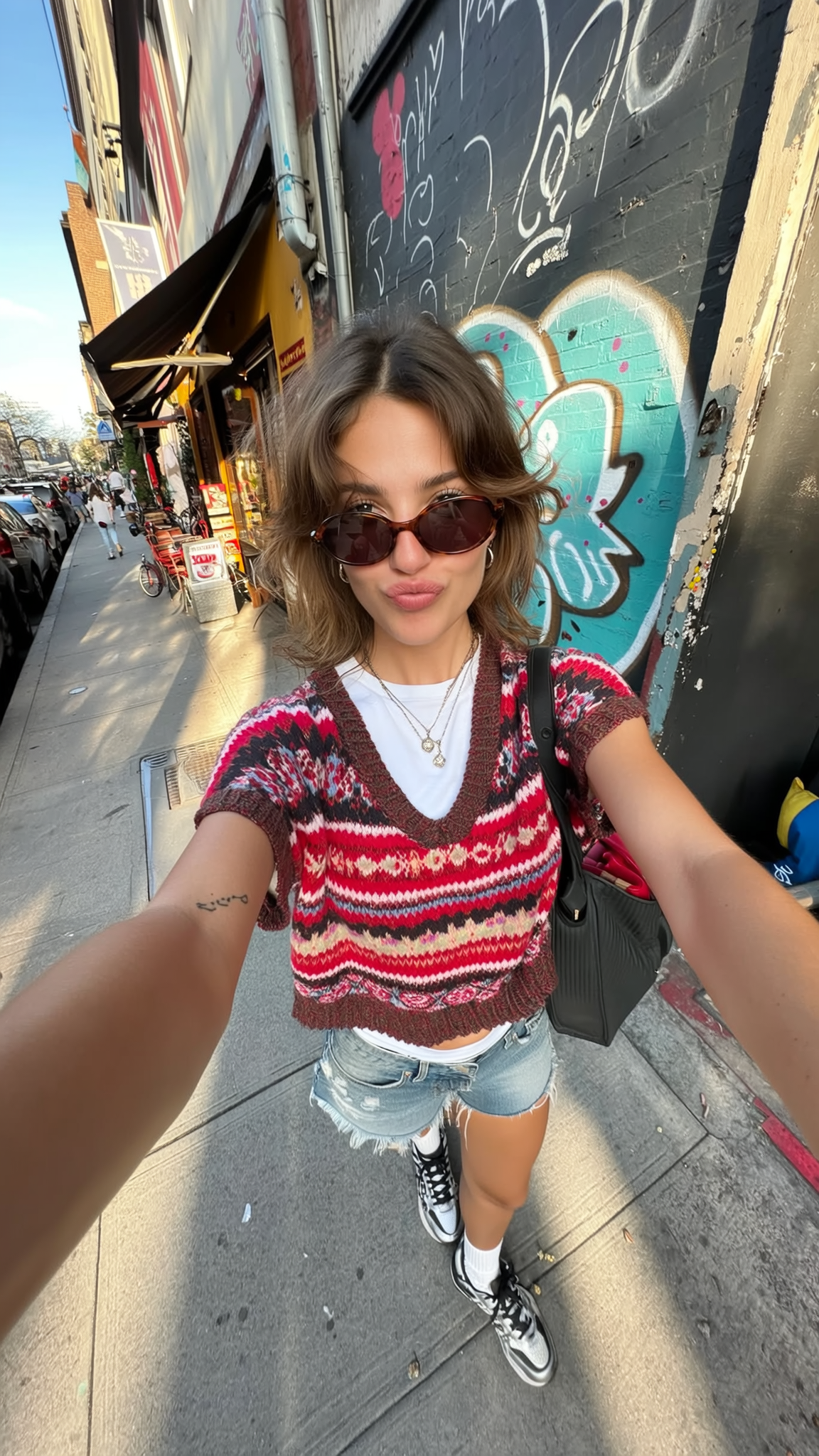 An ultra-wide angle spontaneous selfie captured from a distinctly exaggerated, elevated overhead viewpoint typical of iPhone photography. The young woman engages the camera directly with a playful, neutral expression, her oversized head and expressive upper body prominently exaggerated by the wide-angle distortion. She sports an original casual outfit combining a loose, brightly patterned knit sweater layered over a simple white tee, paired with creatively distressed denim shorts and chunky city sneakers, accessorized with layered delicate necklaces and quirky oval sunglasses. Her tousled hair is styled in effortless beachy waves, with natural highlights catching the sunlight authentically. She stands on a bustling urban sidewalk near a colorful graffiti wall and sun-dappled café exteriors, with realistic textures of cracked concrete, worn paint, and vibrant city life subtly blurred in the background. The natural afternoon sunlight casts soft, warm shadows, enhancing realistic skin textures, gentle fabric wrinkles, and delicate reflections in her sunglasses. The framing mimics a one-hand held selfie, showcasing her extended arm slightly foreshortened by the wide-angle lens, adding dynamic casualness. The overall style evokes a spontaneously playful, stylishly urban, and effortlessly authentic social media selfie aesthetic.
