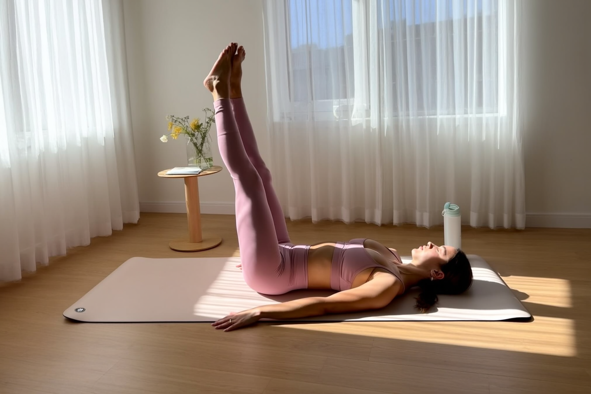 A young woman in a soft pink matching workout set lies on her back on a light beige yoga mat, stretching her legs into the air. Natural sunlight streams through sheer curtains, casting soft lines across her body and the wooden floor. A small round table with flowers stands near her, and a water bottle sits by her mat. iPhone-style composition, soft shadows, cozy minimal Scandinavian interior.