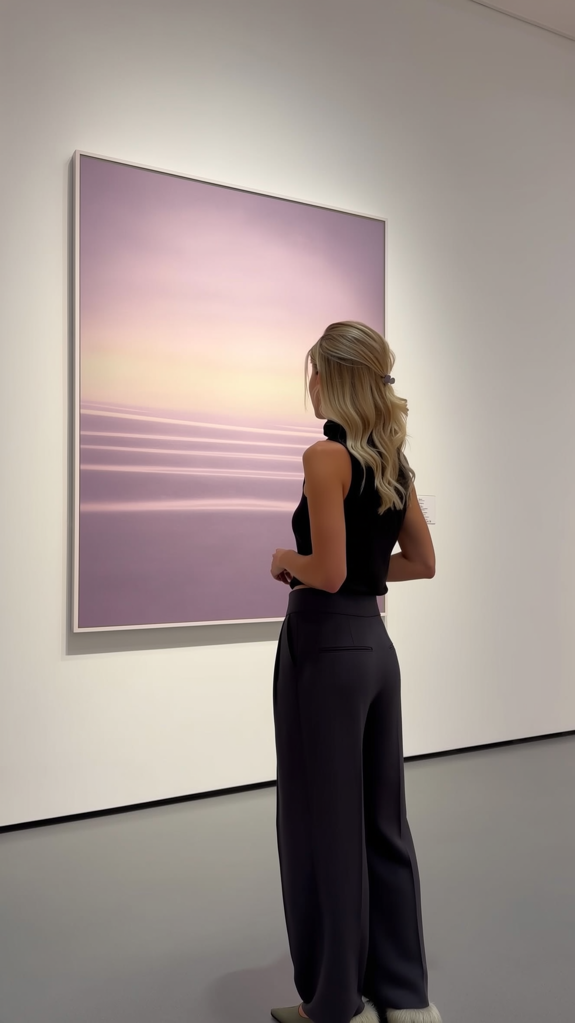 High-resolution iPhone photograph captured from a subtle low angle, tightly composed to showcase a stylish young woman standing at medium distance in a serene, airy minimalist gallery space. She is seen from behind and slightly to the side, her wavy blonde hair cascading naturally over her shoulders with a gentle sheen under soft, diffuse indoor lighting that enhances the pastel tones of the large modern artwork she observes. The artwork—an expansive piece rendered in muted pastel colors—hangs prominently on the pristine white gallery wall, creating a clean, graphic background that emphasizes the tranquil atmosphere. The woman wears a fashion-forward ensemble featuring a sleek, high-neck sleeveless black top tucked neatly into tailored high-waisted culottes with subtle platform shoes just visible beneath, their delicate creases and texture subtly revealed in the soft light. Her relaxed, candid pose—arms resting naturally at her sides—suggests thoughtful engagement with the art, while the soft, even lighting sculpts the textures of her outfit and hair without harsh shadows. This tightly composed frame captures a calm, editorial moment of quiet reflection within a minimalist modern art gallery setting, exemplifying a refined, fashion-centric aesthetic.