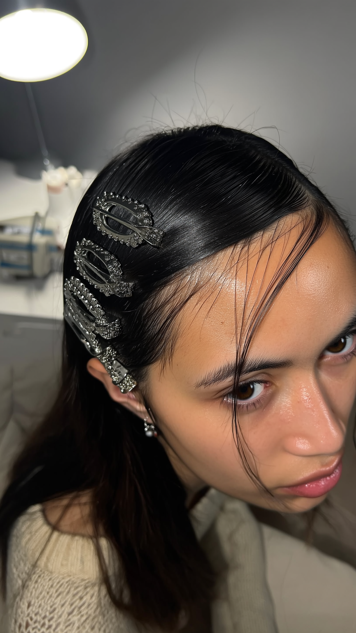 Matte metal barrettes stack like a sleek ladder along a deep side part, their textured surfaces catching a muted glow from a softly diffused bedroom desk lamp. A calm-faced girl meets the gaze directly, her glass-skin glow subtly shimmering, while fly-away strands trace gentle shadows across her forehead. The close frame skews slightly high-angle, capturing delicate pores and the fine fuzz of her knit collar peeking into the shot. Background hints of city pavement blocks blur faintly, grounding this intimate moment of stillness and style perfectly—authentic iPhone close-up, statement hair-clip focus