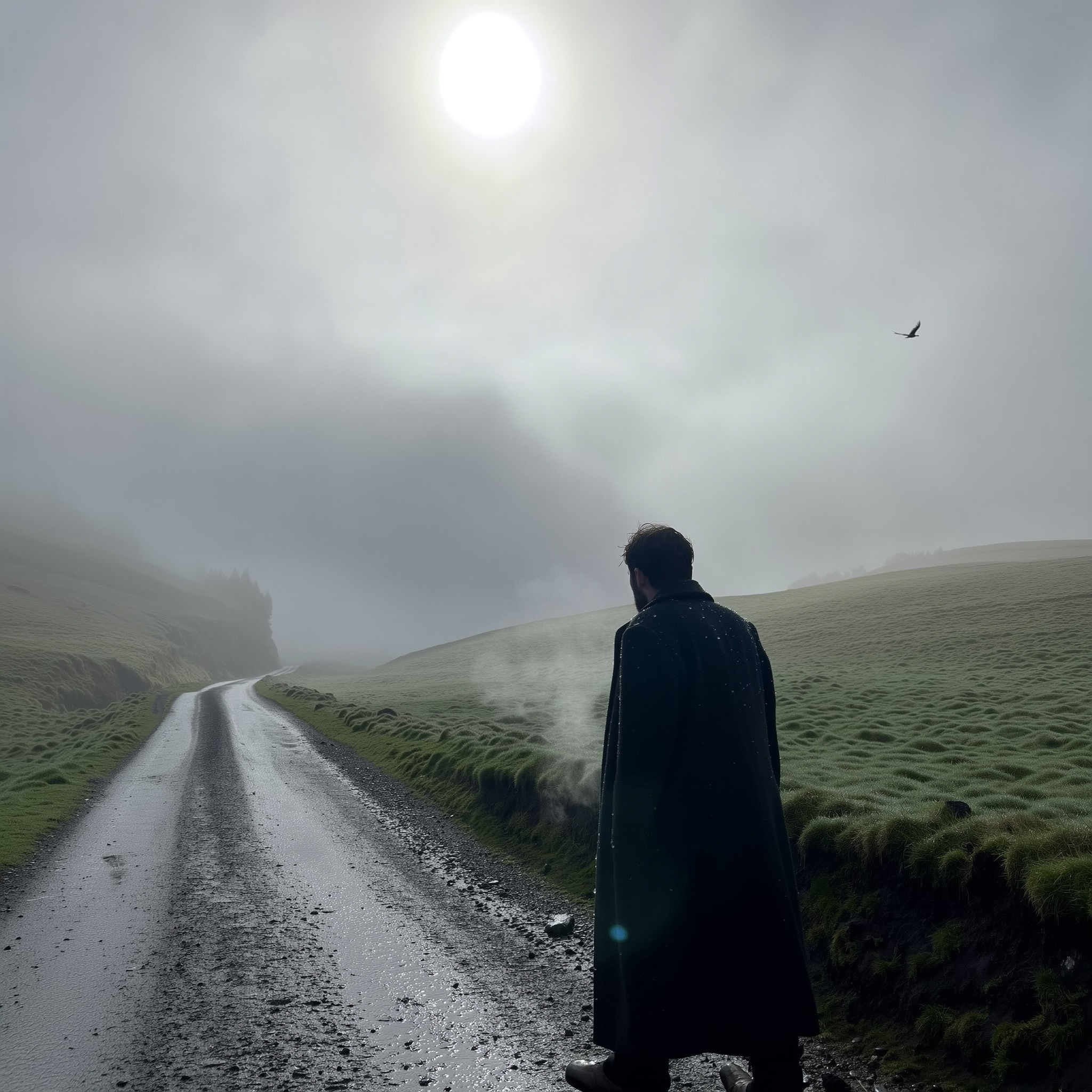 A solitary man clad in a heavy, dark wool coat lingers on a slick, muddy rural path, his posture still as he peers into the dense, swirling fog that cloaks rolling hills beyond. The damp coat fibers catch subtle beads of moisture, while his breath forms faint, ghostly puffs that mingle with the low, whispering mist. Under an overcast, muted sky, the landscape dissolves into soft gradients of grey and mossy green, the horizon line fading into a nearly white haze. Captured from waist height with a slight, unsteady tilt, the iPhone's grain softens shadows and renders a faint glow from a concealed sun above; the scene hums with the quiet drip of condensation and a distant crow’s solitary call. Generous negative space surrounds him, amplifying the hush of early morning solitude—mistbound reverie, shot on iPhone