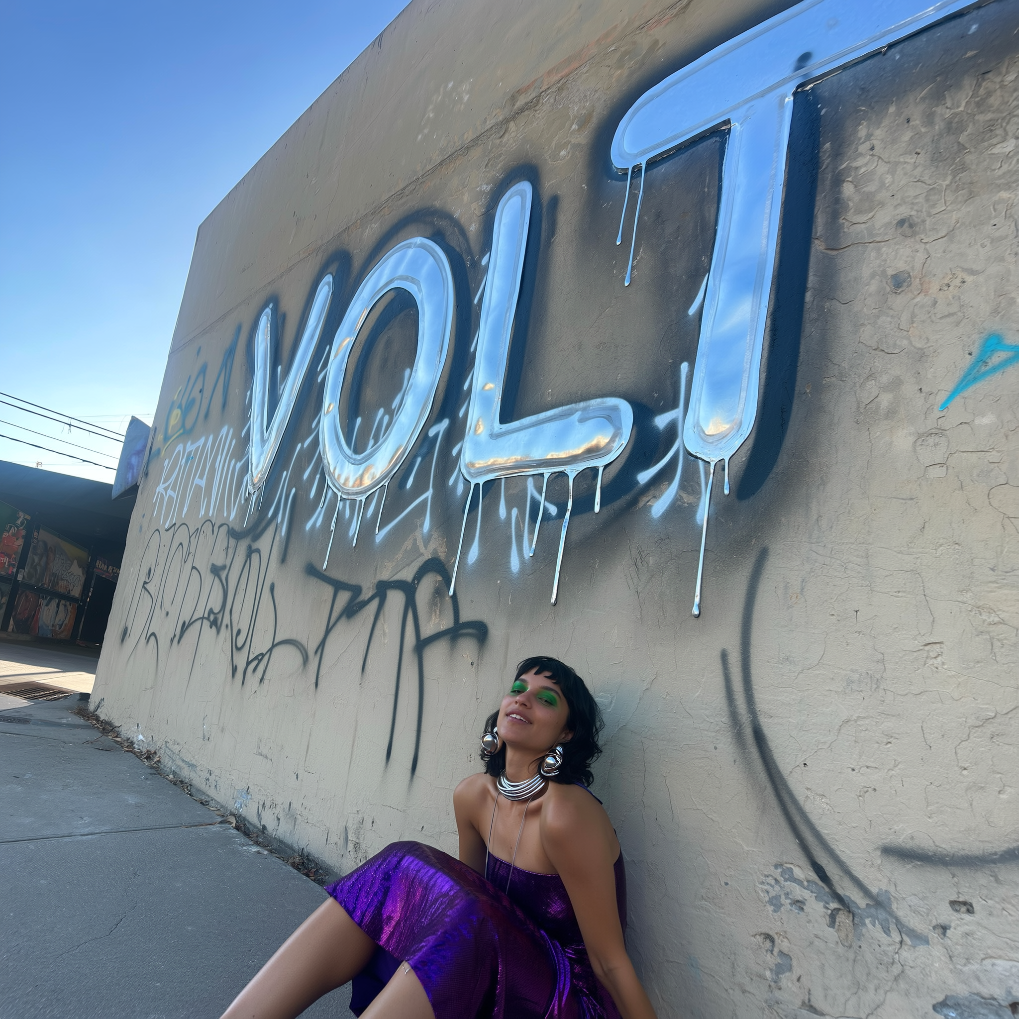 She has striking green eyebrows and wears a deep purple wrap skirt, her reflective silver jewelry catching subtle silvery highlights from the metallic graffiti. The scene is set against a weathered concrete wall with faint graffiti textures around the chrome letters. Natural daylight softly illuminates the scene, enhancing the reflective surfaces and casting gentle shadows. The photo is taken with a casual, slightly tilted angle from eye level, typical of spontaneous iPhone photography, capturing authentic street ambiance and raw urban textures with realistic imperfections.