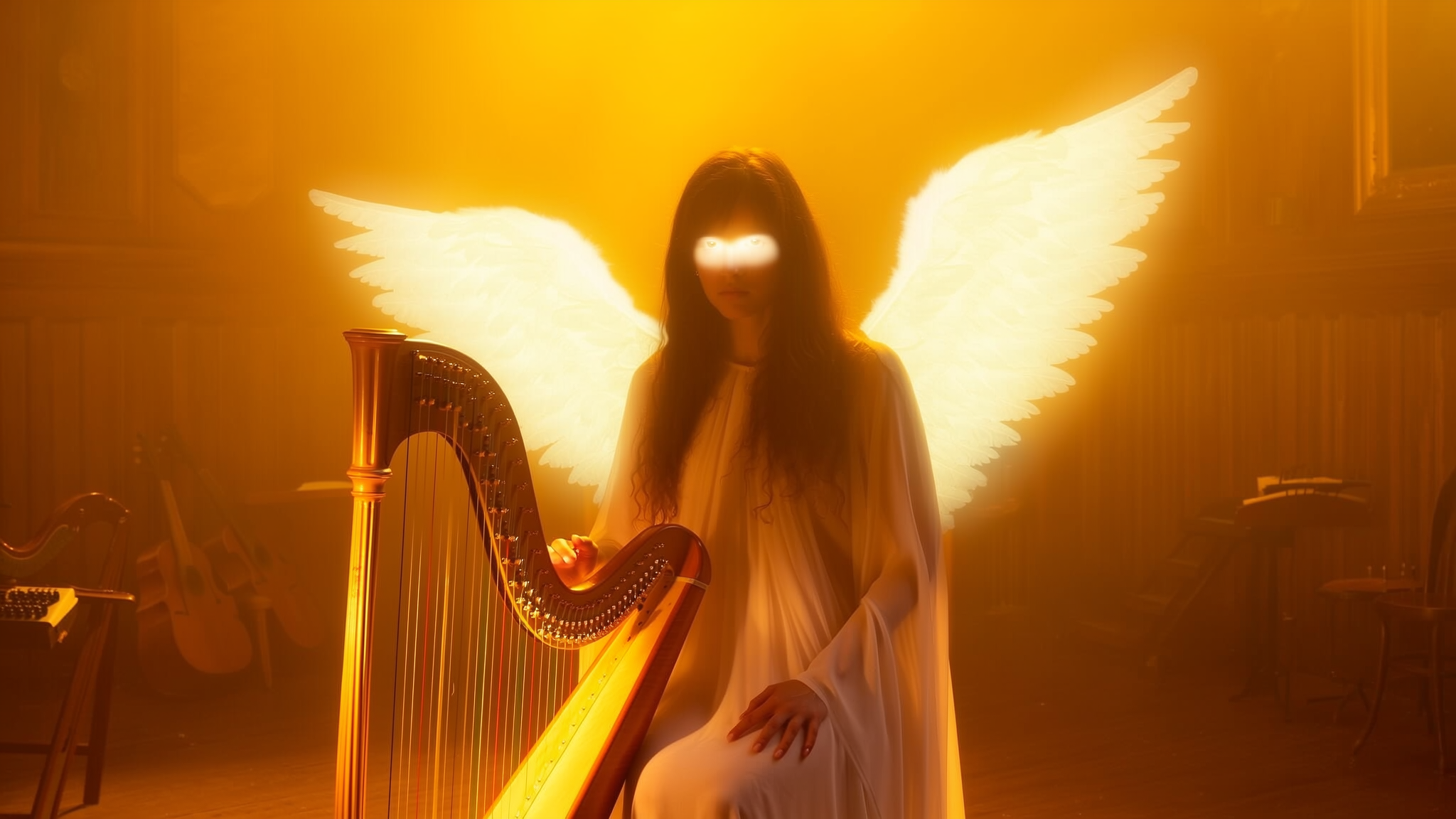 An upper-body close-up of a brunette woman seated beside a harp in an old music room, the scene bathed in the golden flicker of candlelight that softly dissolves all details. Her dark eyes are visible through a veil of glowing overexposure; her sheer robe blends pale blush and ivory tones, erased by the intense ambient light. Both her small angel wings extend fully within the frame, glowing with soft, diffuse edges, fading gently into the surrounding haze. Her fingers rest lightly on the harp strings, which themselves blur into the warm light. The background shows only faint, blurred outlines of aged wood and shadowed instruments, submerged in an ambient dimness. The atmosphere is silent and weightless, a suspended moment heavy with forgotten melodies, where the angel’s glowing presence seems to dissolve into the hazy golden glow.