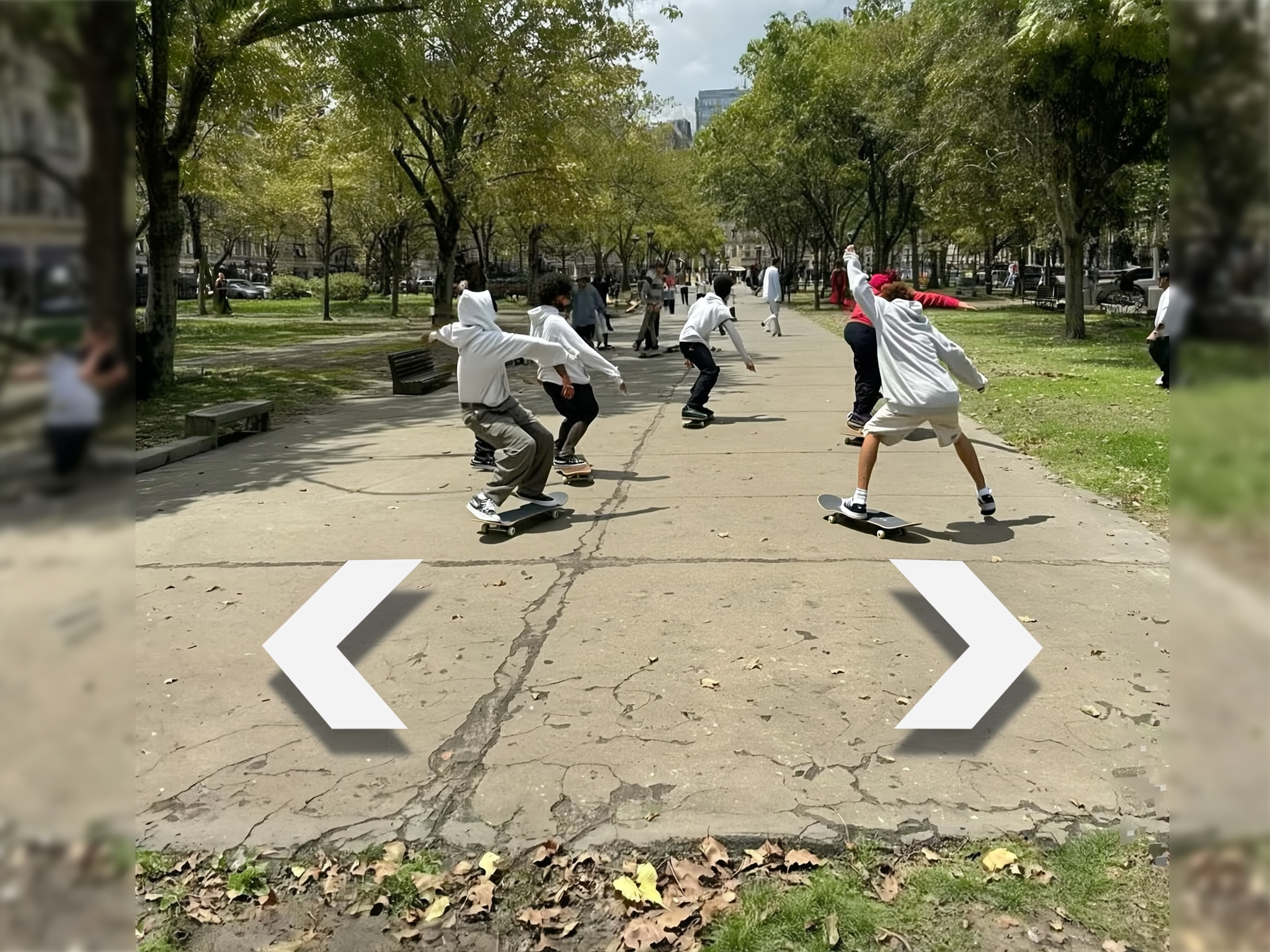 A group of casually dressed skateboarding teens is captured mid-action on a wide, worn concrete path running horizontally through a sunny green city park scattered with grass patches and mature trees. Some teens perform tricks with blurred motion, their loose t-shirts and hoodies moving naturally. Two bold, digital-white Google Street View navigation angle brackets float side by side just above the cracked concrete pathway near the lower part of the frame, spaced evenly and pointing logically left and right, casting soft subtle shadows below. The bright midday sunlight creates flat, neutral colors and gentle shadows, imparting a candid yet dynamic atmosphere. The wide-angle, slightly off-center framing catches the expansive park environment with the path extending left to right across the image, while the tactile textures of chipped concrete, scattered leaves, and sunlit grass blend with skateboards and casual streetwear. This spontaneous, energetic moment is captured with realistic motion blur and an immersive digital navigation edge typical of Street View, with faintly blurred passersby glimpsed in the background among the trees.